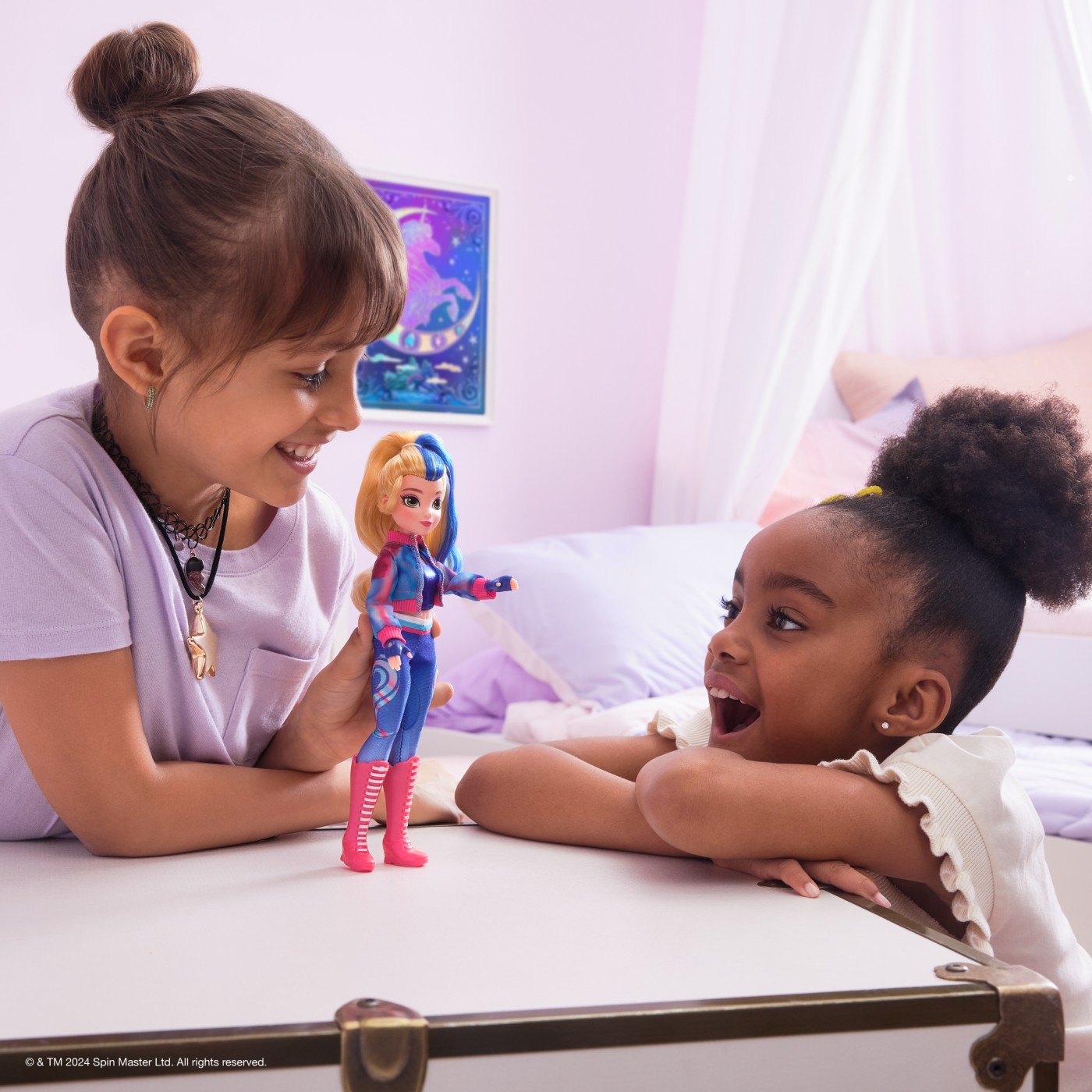 Creeaza acasa aventuri fermecatoare Academia Unicorn cu papusile la moda Sophia, Ava si Isabel. Inspirate din serialul animat NETFLIX si din seria de carti de succes in care prietenia tine fraiele, aceste papusi de 24,1 cm pentru fete dau viata personajelor. Frumos detaliata din cap pana in picioare, personalitatea efervescenta a Avei iese la iveala in parul ei cu suvite (accesoriu de coafat inclus) si in tinuta ei caracteristica de calaret de unicorn: rochia roz si albastru-verzui, pantaloni ombre cu marcaje Magia plantelor, cizme florale si agrafe de par, manusi si accesorii pentru papusi cu centura cu fluturi. Cu 9 puncte de articulatie, pozitioneaz-o pe Ava in timp ce protejeaza Insula Unicornului si magia sa si calareste in aventura cu unicornul ei, Leaf (vandut separat). Legaturile magice dintre elevii Academiei Unicorn si unicornii lor vor starni povesti pline de imaginatie. Pentru mai multe moduri de a experimenta Academia Unicorn alaturi de personajele tale preferate, cauta papusile Sophia si Isabel si unicornii lor, Wildstar Lumina Curcubeului si River (suvoi) (fiecare se vinde separat) si extinde-ti lumea. Pentru copiii carora le plac unicornii si jucariile cu cai, papusile si accesoriile, jocurile de casa de papusi, jucariile de colectie, jucariile de plus si multe altele, jucariile Academia Unicorn sunt cadouri distractive de de ziua de nastere pentru fete sau cadouri pentru orice ocazie.