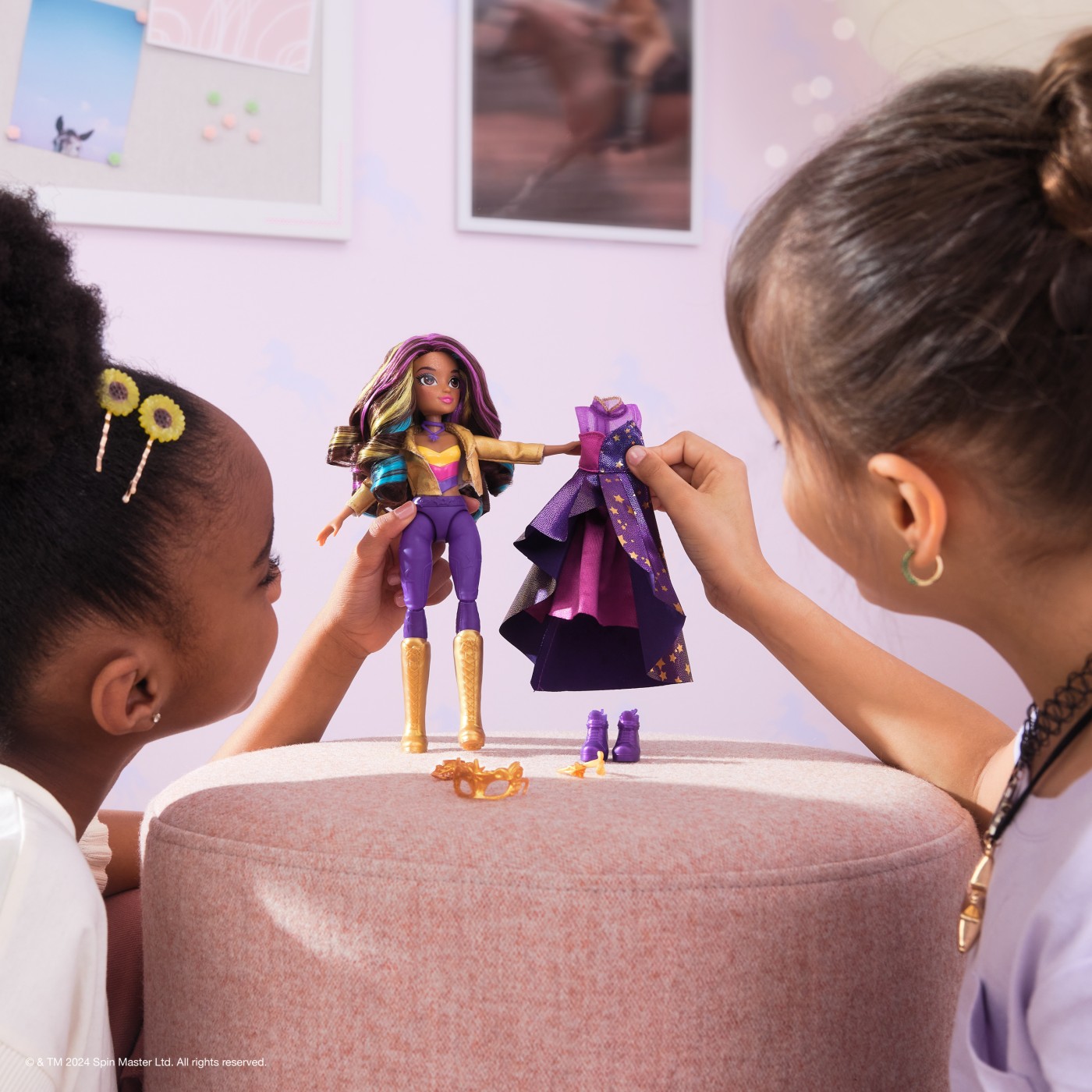 Sarbatoreste magia Zanelor Sortii la balul mascat al Academiei Unicorn cu papusa Bal Mascat- Sophia. Inspirata de serialul animat NETFLIX si de cele mai bine vandute carti, aceasta papusa la moda de 24,1 cm ii da viata Sophiei. Cu detalii autentice si 9 accesorii pentru papusi, Sophia vine in echipamentul ei de calarie, gata sa calareasca spre aventura cu unicornul ei, Wildstar Lumina de Curcubeu (vandut separat). Cand vine timpul pentru bal, schimbati-o pe Sophia din jacheta detasabila, colierul si cizmele ei cu rochia asimetrica cu imprimeu cu stele, centura, masca si botinele mov. Coafeaza-i parul suvitat intr-o coafura cu instrumentul de par si cu agrafa de par. Cu 9 puncte de articulatie, pozitioneaz-o pe Sophia in timp ce recreezi scene din serial. Pentru mai multe moduri de a experimenta Academia Unicorn alaturi de personajele tale preferate, extinde-ti lumea cu papusile Ava si Isabel si unicornii lor, Leaf (Frunzis) si River (suvoi) (fiecare se vinde separat). Legaturile magice dintre elevii Academiei Unicorn si unicornii lor vor starni povesti pline de imaginatie. Pentru copiii carora le plac unicornii si jucariile cu cai, papusile si accesoriile, jocurile de casa de papusi, jucariile de colectie, jucariile de plus si multe altele, jucariile Academia Unicorn sunt cadouri distractive de ziua de nastere pentru fete sau cadouri pentru orice ocazie. Adu acasa papusa de lux Sophia-Bal Mascat de la Academia Unicorn.