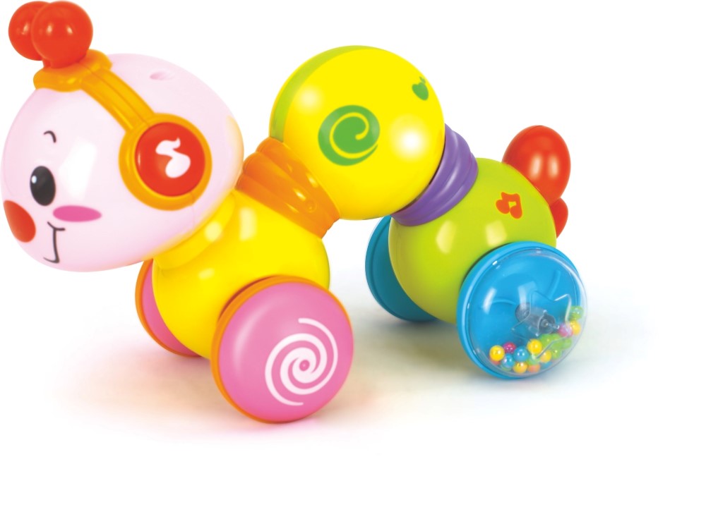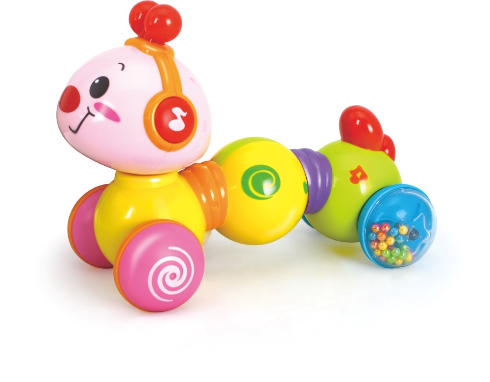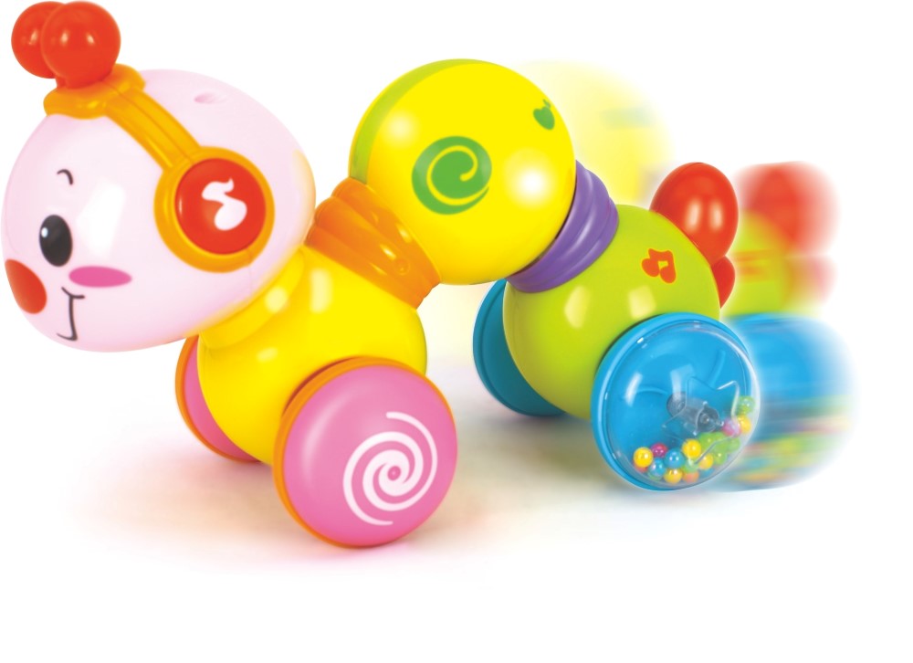 Jucariile contribuie la dezvoltarea copiilor si jocul este o parte esentiala a cresterii. O jucarie este un obiect pentru care un copil se joaca. Împingeti si apasati pe partea din spate a viermisorului, acesta va porni la drum, iar copilul va fi incurajat sa faca si el miscare. Jucaria Viermisorul Fericit poate si canta si lumina cand cand este actionat butonul plasat pe capul lui. Sunt incluse mai multe melodii. Dezvolta coordonarea ochilor mainii si invata conceptul de cauza si efect. Ofera-i copilului o atmosfera de distractie