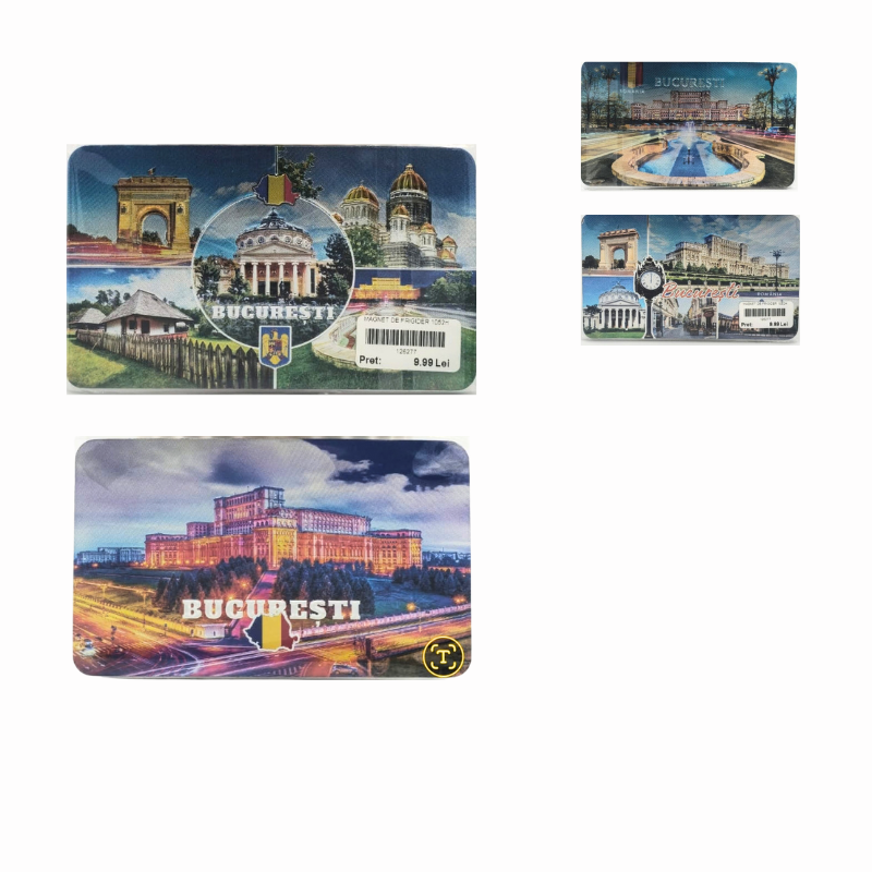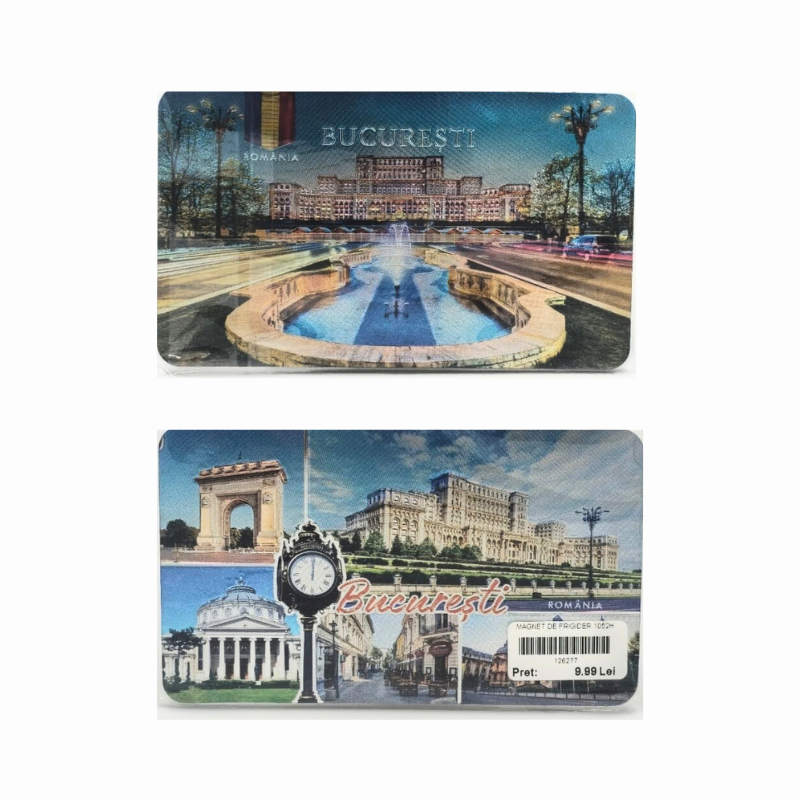 Magnetul de frigider Bucuresti 15x7 cm este un suvenir decorativ cu design reprezentativ pentru capitala României, potrivit pentru colecționari, turiști sau pentru a oferi o mică atenție cu tematică locală.