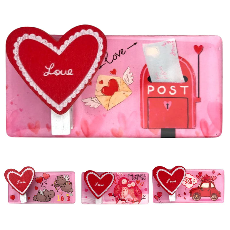 Acest magnet este confecționat din plastic și este prevăzut cu un cârlig, fiind decorat cu o inimă și mesaje de dragoste. Designul este realizat în patru modele diferite, conform imaginilor de prezentare, fiecare elemente grafice specifice tematicii romantice. Magnetul poate fi folosit atât ca obiect decorativ, cât și pentru agățarea notificărilor sau a obiectelor ușoare pe suprafețe metalice. Dimensiunile produsului sunt de 9x4 cm.