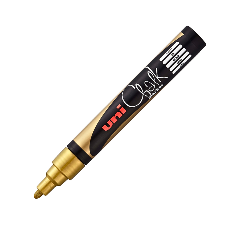 Creează mesaje clare și decorative cu markerul cu cretă Uni Chalk, vârf rotund 1.8–2.5 mm, auriu. Ideal pentru vitrine, whiteboard, plastic sau metal. Se șterge ușor cu o cârpă umedă!