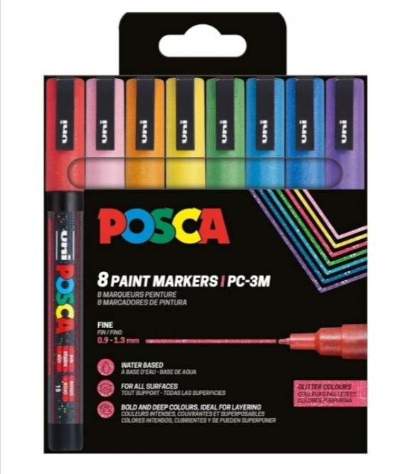 Setul de markere UNI Posca PC-3ML cu sclipici adaugă un plus de personalitate și strălucire oricărui proiect artistic. Fie că lucrezi la decorațiuni, ilustrații, scrapbooking sau obiecte personale, aceste mărci oferă un efect spectaculos datorită particulelor de glitter integrate în cerneala opaca.
