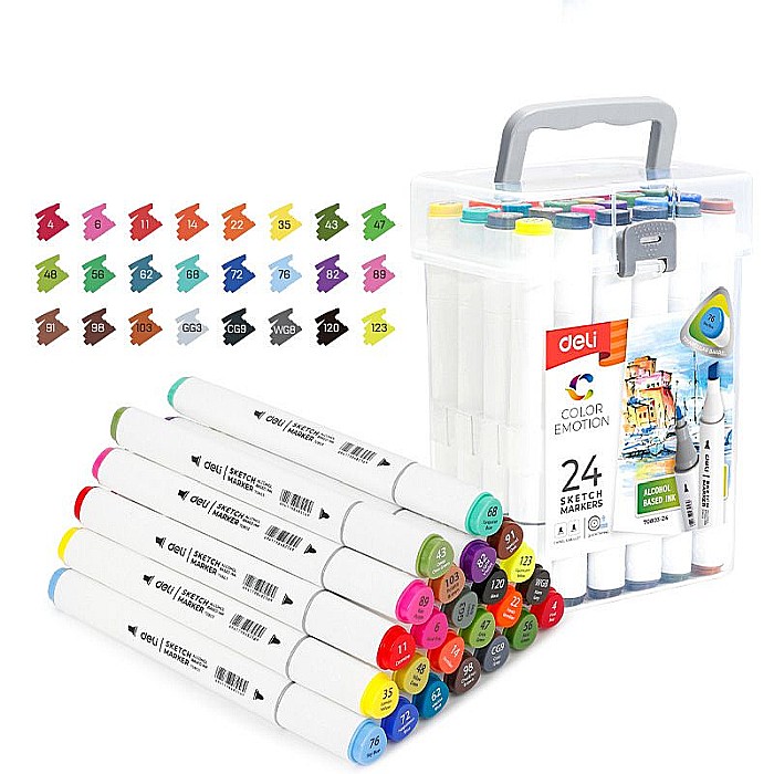 Setul DELI Color Emotion conține 24 de markere cu vârf dublu pentru scris și desen. Fiecare marker are un capăt rotund de 1 mm și unul teșit de 1–7 mm. Cerneala pe bază de alcool asigură culori intense și uscare rapidă.