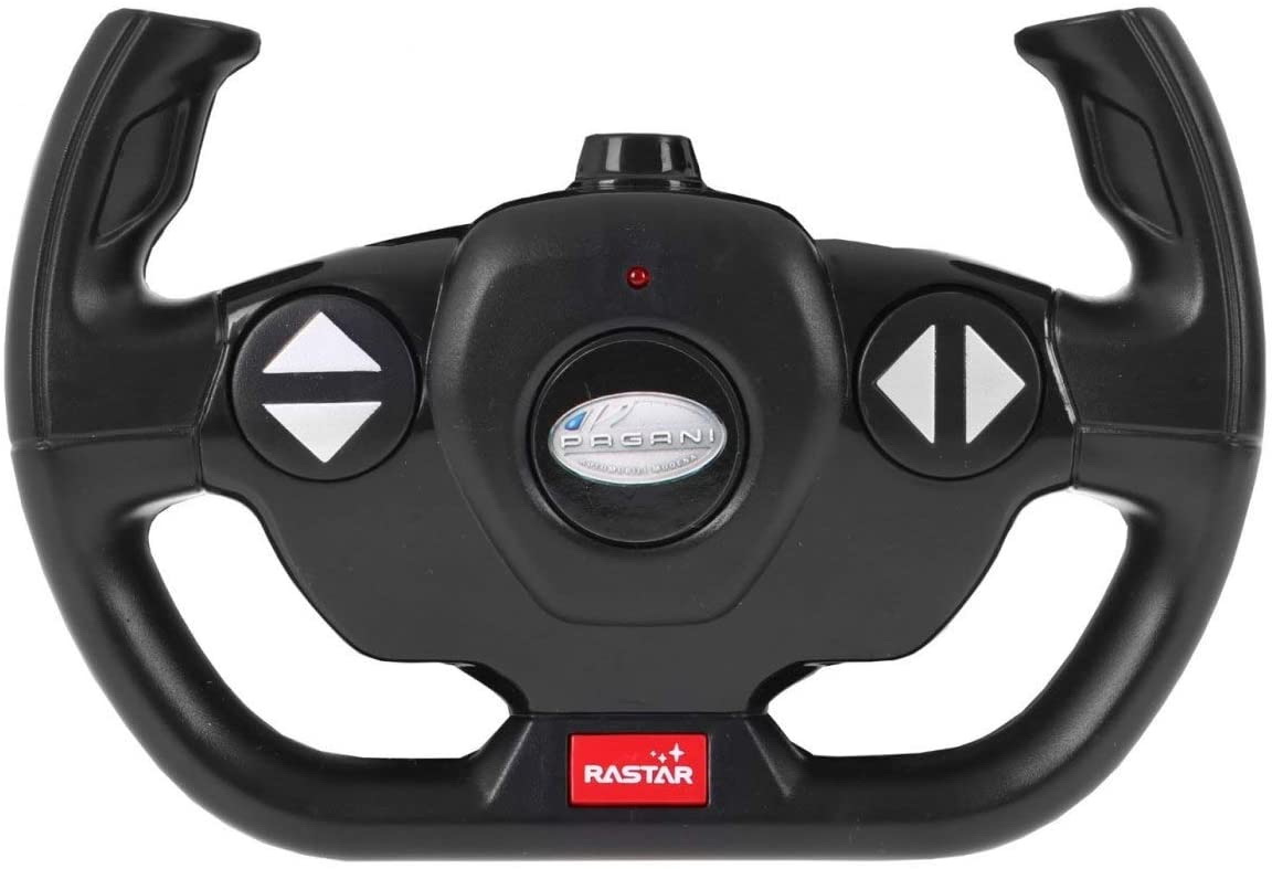 Copilul dumneavoastra se poate juca in voie cu masina cu telecomanda Pagani Zonda R, scara 1 la 14, oferita de brandul international Rastar. Nicio cursa nu este imposibil de castigat cu acesta masinuta, replica oficiala cu licenta a modelului original, construita cu mare atentie la detalii. Masinuta are proportiile ideale pentru momente pline de distractie si amuzament, avand dimensiunile in centimetri dupa cum urmeaza : 34.9*14.8*8.4.Masinuta functioneaza pe frecventa de 2.4G.Alimentarea se face astfel : pentru masinuta sunt necesare 5 baterii tip AA , iar pentru telecomanda 2 tip AA.Masinuta se poate deplasa in toate directiile : inainte, inapoi, stanga sau dreapta. Masina cu telecomanda Pagani Zonda R, scara 1 la 14, poate rula cu o viteza aproximativa de 10km/h, are tractiune 2WD, anvelope de cauciuc, posibilitate de reglaj a directiei direct pe sasiu si o raza de actiune a telecomenzii de circa 20 de metri.Acesta masinuta are si o functie suplimentara care face ca farurile si stopurile masinutei sa lumineze.