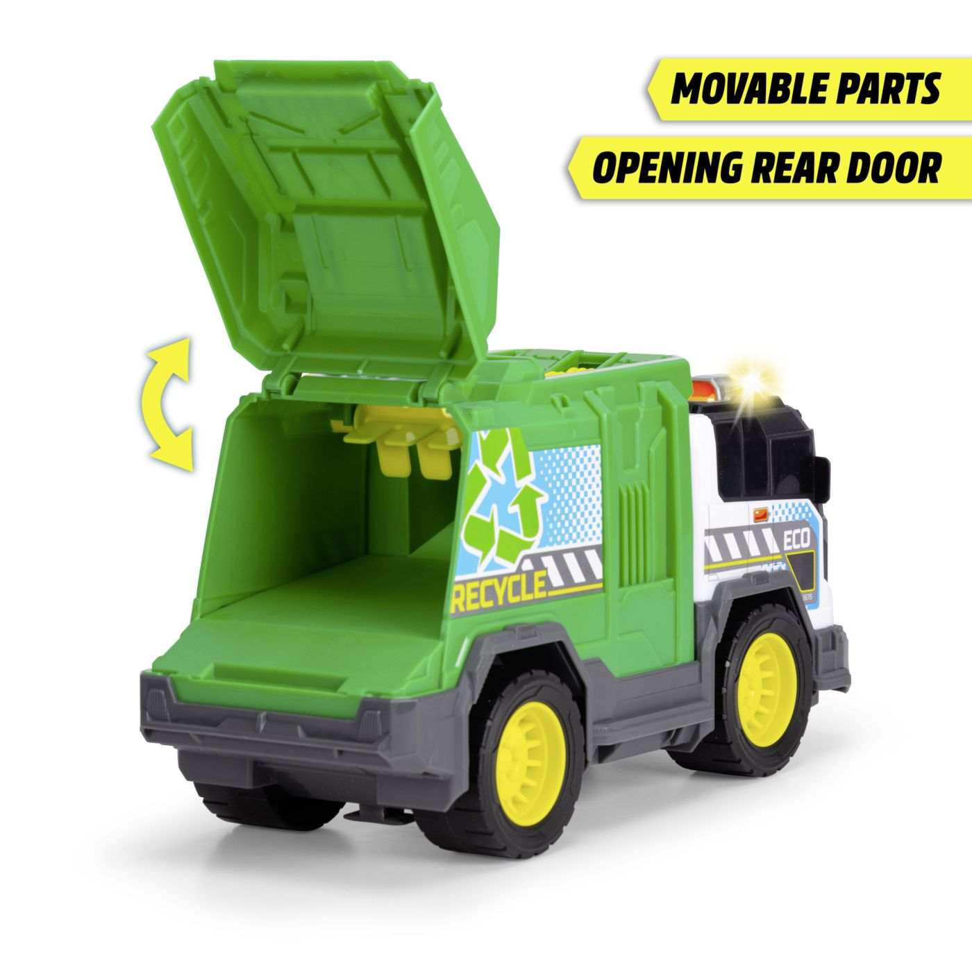 Dickie Toys - Camion de reciclare 30 cm. Camionul de gunoi mare cu functii si accesorii, jucarie pentru colectarea gunoiului pentru copii cu varsta peste 3 ani, cu lumina si sunet, incl. baterii. Copiii cu varsta de 3 ani si peste pot goli jucaus cosul de gunoi si pot transporta obiecte mici prin rotatia de gunoi in interiorul vehiculului. Cand hayonul este deschis, continutul aluneca automat din masina de jucarie de 30 cm - astfel incat camionul de gunoi sa fie rapid gata pentru urmatorul tur! Cu sunetele realiste ale pornirii motorului, bipurilor in marsarier si golirea cosului, precum si o lumina de avertizare pe acoperis, jocul cu camionul devine si mai incitanta (baterii incluse).