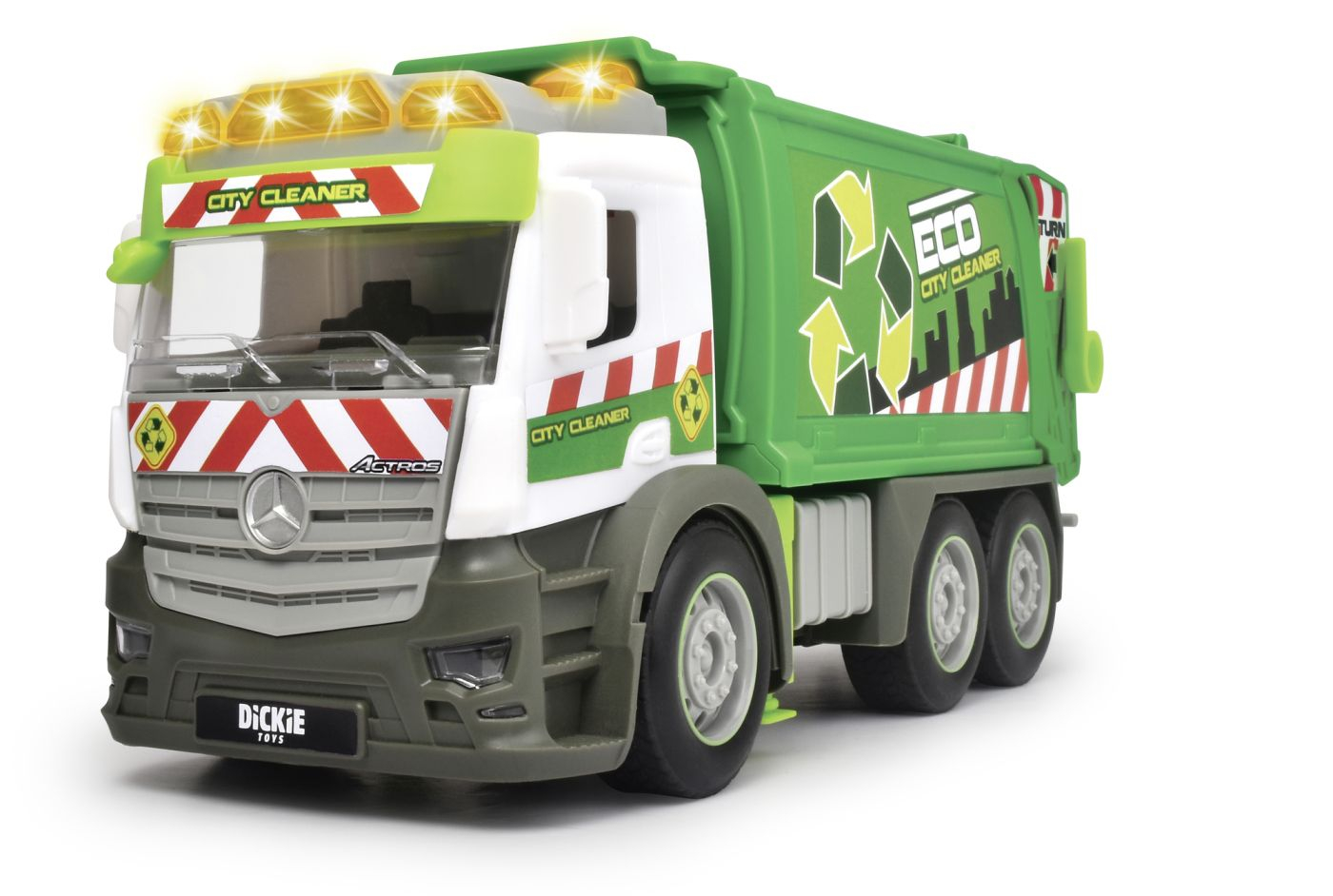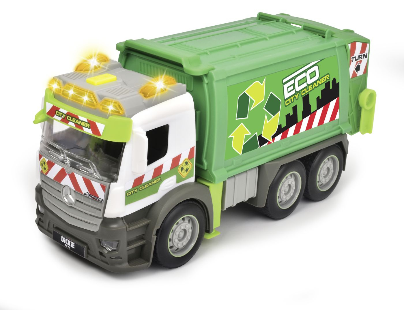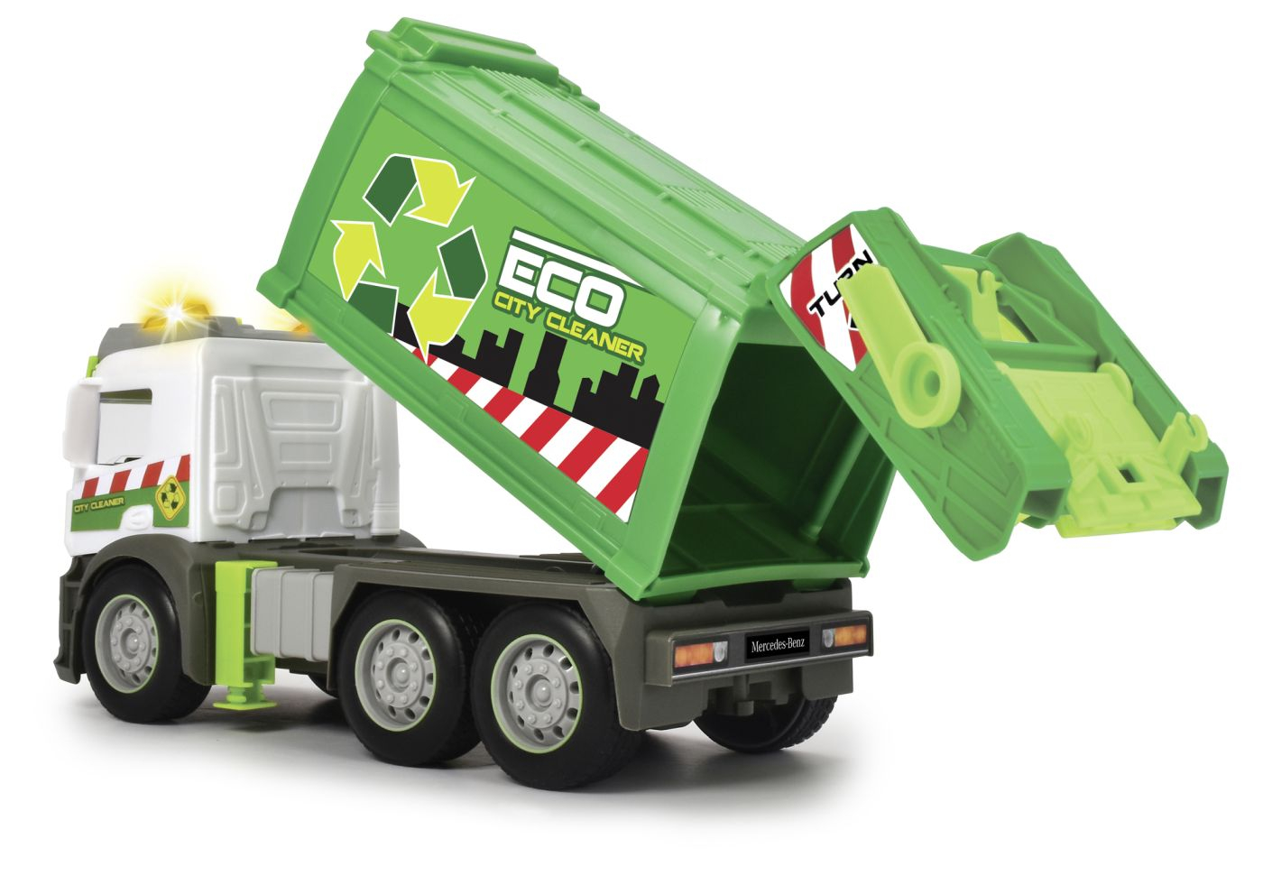 Action Truck Garbage – Vehicul pentru deseuri cu cos de gunoi, efecte sonore si lumina de avertizare, functie de incarcare/descarcare. Acest camion de 26 cm le permite copiilor mici sa se cufunde in lumea unui colector de gunoi. Vehiculul vine cu un cos mare pentru incarcarea si descarcarea deseurilor. Camionul este modelat pe un vehicul original Mercedes. Are, de asemenea, un motor de frecare incorporat care propulseaza vehiculul la cativa metri cand impins. Vehiculul are efecte sonore realiste si o lumina de avertizare portocalie, care poate fi declansata prin apasarea unui buton. (Include 2x baterii AAA.)