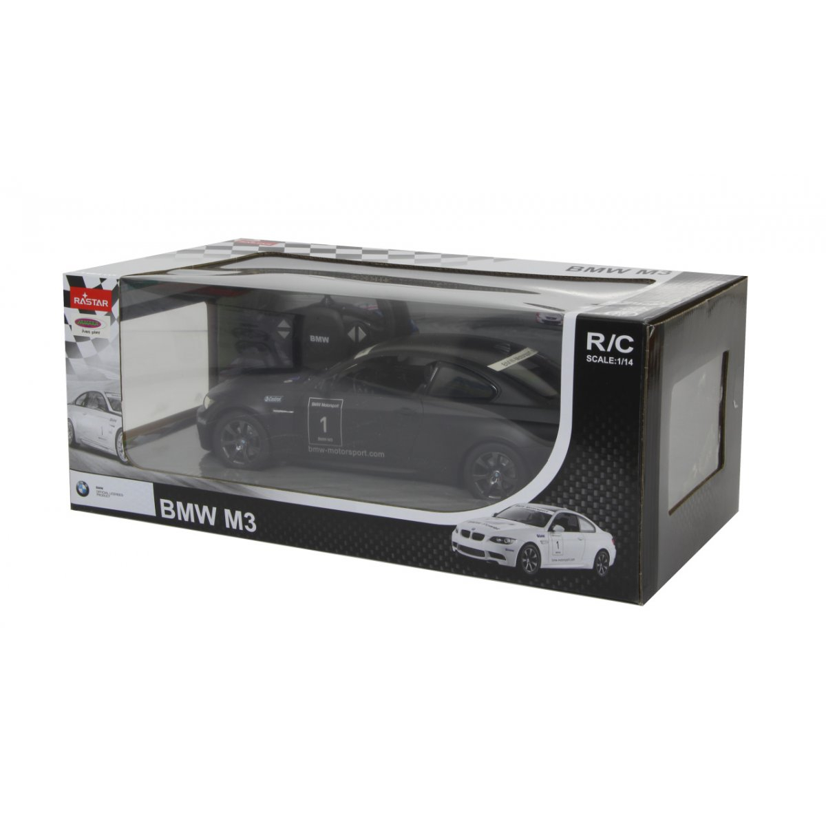 Copilul dumneavoastra se poate juca in voie cu masina cu telecomanda BMW M3, scara 1 la 14, oferita de brandul international Rastar. Nicio cursa nu este imposibil de castigat cu acesta masinuta, replica oficiala cu licenta a modelului original, construita cu mare atentie la detalii. Masinuta are proportiile ideale pentru momente pline de distractie si amuzament, avand dimensiunile in centimetri dupa cum urmeaza : 32.3*14.8*13.9.Masinuta functioneaza pe frecventa de 2.4G.Alimentarea se face astfel : pentru masinuta sunt necesare 5 baterii tip AA , iar pentru telecomanda 2 tip AA.Masinuta se poate deplasa in toate directiile : inainte, inapoi, stanga sau dreapta. Masina cu telecomanda BMW M3, scara 1 la 14, poate rula cu o viteza aproximativa de 10km/h, are tractiune 2WD, anvelope de cauciuc, posibilitate de reglaj a directiei direct pe sasiu si o raza de actiune a telecomenzii de circa 20 de metri.Acesta masinuta are si o functie suplimentara care face ca farurile si stopurile masinutei sa lumineze.