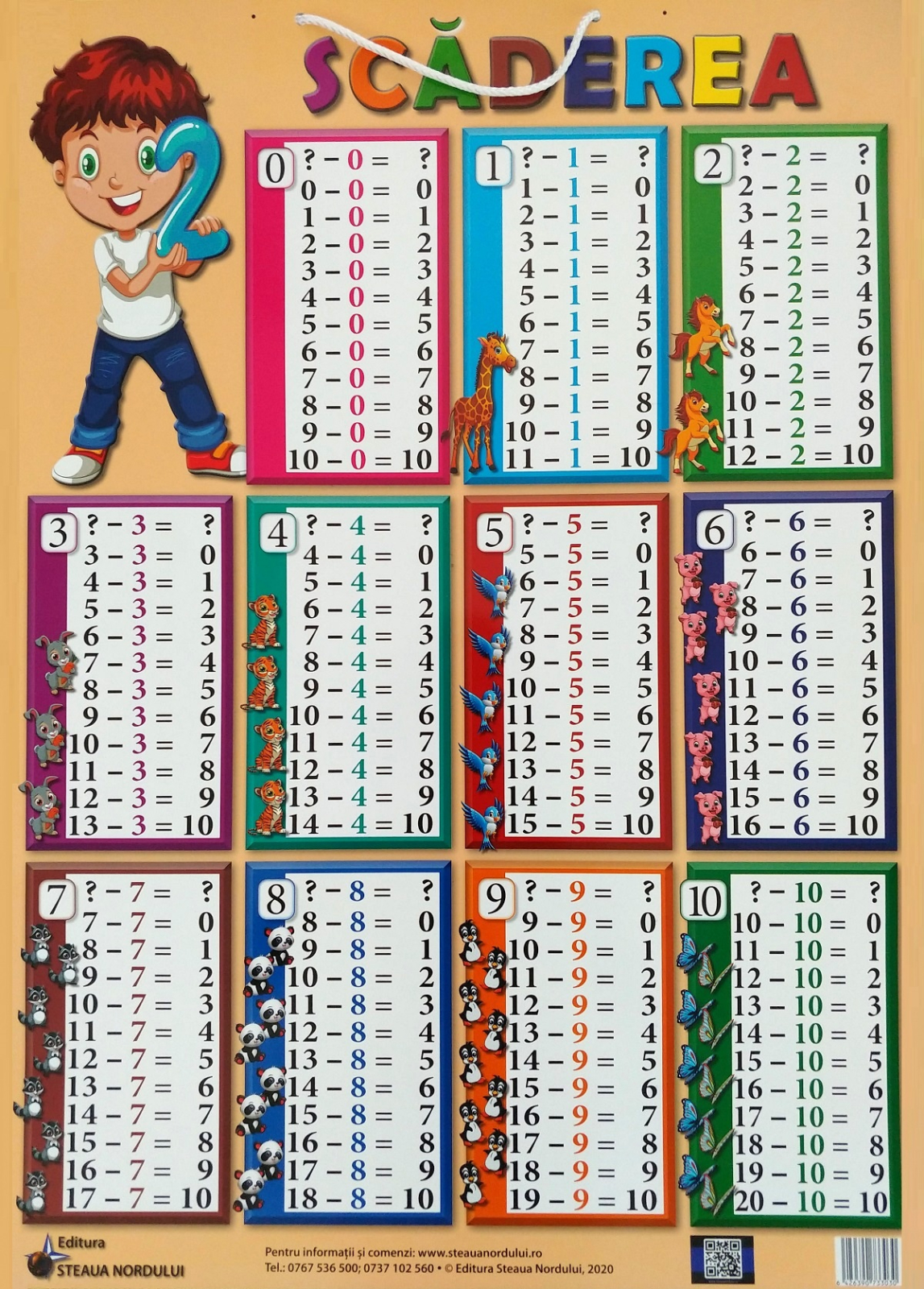 Această planșă de mari dimensiuni ajută pe copii să învețe scăderea numerelor de la 1 la 10. Operațiunile sunt clare și ușor de urmărit, cu și fără trecere peste ordine. Este potrivită pentru peretele clasei sau pentru studiul de acasă.