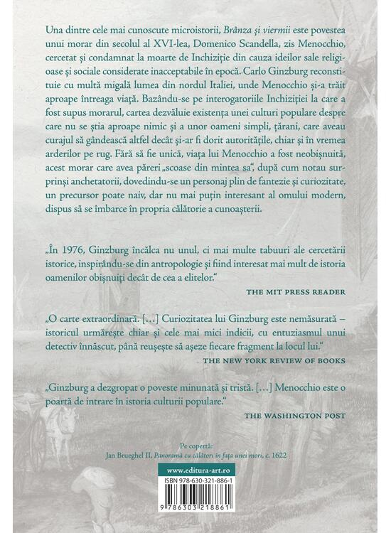 Inspirată din documente autentice ale Inchiziției, lucrarea lui Carlo Ginzburg reconstituie universul lui Domenico Scandella, zis Menocchio, un morar din nordul Italiei care a sfidat dogmele vremii. Bazându-se pe interogatoriile acestuia, autorul descoperă o lume a oamenilor simpli, capabili de reflecții profunde și viziuni originale asupra existenței. Menocchio vedea universul ca pe o brânză în care se nășteau viermii – imagine ce i-a adus condamnarea, dar și un loc unic în istoria gândirii. „Brânza și viermii” este una dintre cele mai influente microistorii, o incursiune în viața și mintea unui om care a îndrăznit să pună întrebări interzise.