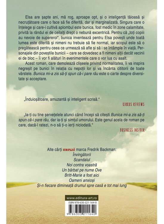 Bunica mi-a zis să-ți spun că-i pare rău, de Fredrik Backman, este un roman care explorează cu sensibilitate și umor legătura dintre generații și puterea poveștilor. Elsa, o fetiță de șapte ani cu o inteligență aparte, se simte adesea diferită și respinsă de ceilalți. Singura persoană care o înțelege pe deplin este bunica ei, o femeie excentrică și plină de viață, fost medic în zone calamitate, care refuză să se conformeze regulilor impuse de societate. Bunica îi spune Elsei povești magice, pline de personaje și locuri fantastice, menite să o ajute să facă față provocărilor vieții. Pe măsură ce Elsa descoperă că aceste personaje sunt inspirate chiar din vecinii lor, poveștile devin un sprijin real într-o serie de evenimente neașteptate. Cartea vorbește despre acceptare, diversitate și curajul de a fi tu însuți, fiind în același timp amuzantă, înduioșătoare și profund inspirațională. Fredrik Backman reușește să îmbine realitatea cu magia într-o poveste care atinge cititori de toate vârstele.