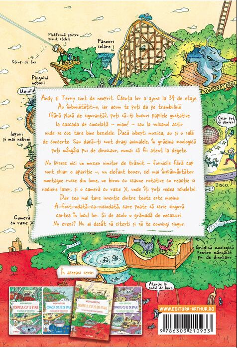 Al treilea volum din seria Copacul cu ... etaje aduce încă o doză de aventură și distracție nebună! Andy și Terry au ajuns la 39 de etaje și și-au dotat căsuța cu cele mai trăsnite invenții: o trambulină uriașă, o cascadă de ciocolată, un vulcan pentru copt bezele, o sală de concerte și chiar o grădină zoologică cu pui de dinozaur. O lectură amuzantă și plină de imaginație, perfectă pentru fanii benzilor desenate.