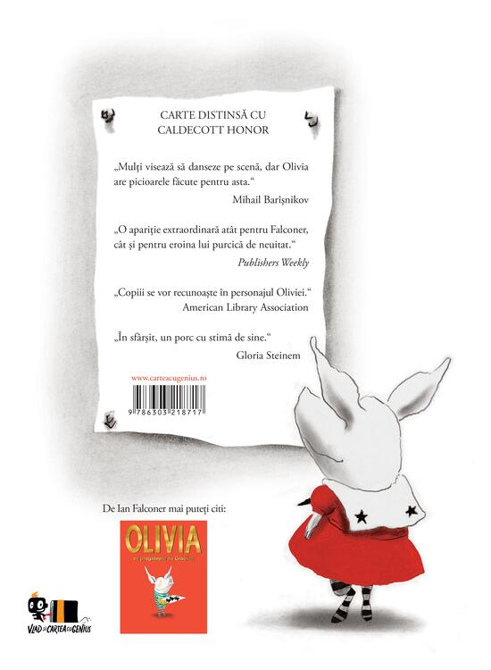 Prima carte a lui Ian Falconer, Olivia, a devenit rapid un clasic modern al literaturii pentru copii. Inspirată de nepoata autorului, povestea o prezintă pe Olivia — o purcelușă precoce, neastâmpărată și extrem de expresivă — în momentele ei de joacă, curiozitate și creativitate. Ilustrațiile minimaliste, realizate în alb, negru și roșu, dau cărții o eleganță aparte, transformând-o într-o mică operă de artă. Distinsă cu Mențiunea Caldecott și apreciată de critici din întreaga lume, Olivia îi cucerește pe cititori prin umor, sensibilitate și autenticitate.