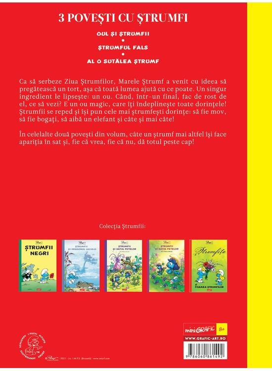 Cartea reunește trei povești îndrăgite cu ștrumfi, create de Pierre Culliford Peyo, în care magia și umorul merg mână în mână. În prima poveste, Marele Ștrumf propune sărbătorirea Zilei Ștrumfilor cu un tort, dar pentru asta lipsește un ingredient esențial: oul. Când, în cele din urmă, ștrumfii găsesc unul, descoperă că este un ou magic, capabil să îndeplinească dorințe. Fiecare ștrumf își cere dorința preferată – de la bogății și animale exotice până la cele mai năstrușnice idei –, iar rezultatele sunt haotice și pline de umor.