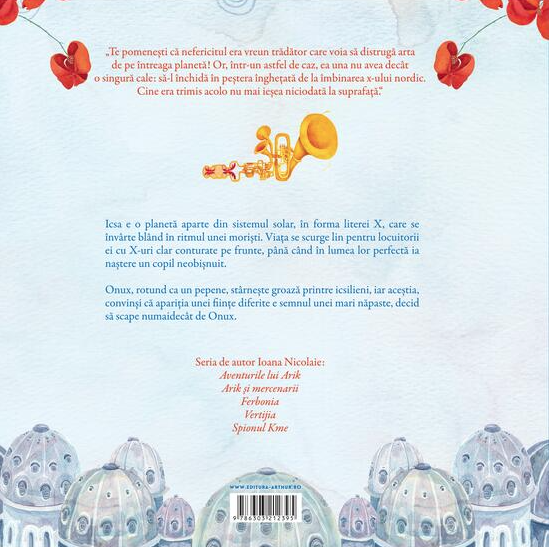 Pe planeta Icsa, viata locuitorilor decurge lin pana la aparitia lui Onux, un copil diferit de toti ceilalti. In fata fricii, icsilienii decid sa il alunge, dar povestea ascunde o lectie importanta despre acceptare. Cartea ii va fascina pe copii prin imaginatie, ilustratii si mesaj.