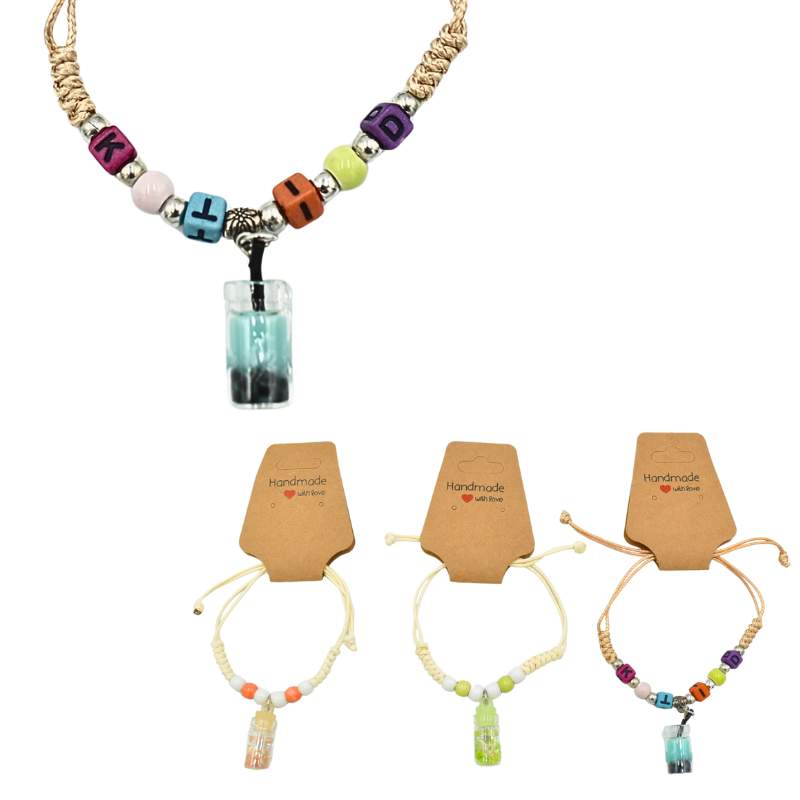 Disponibilă în mai multe combinații de culori și modele, fiecare brățară are un pandantiv unic tip sticluță decorată, simbol al prieteniei și al momentelor speciale. Este un accesoriu potrivit atât pentru copii, cât și pentru adolescenți, ideal pentru a fi purtat în pereche ca simbol al prieteniei BFF.