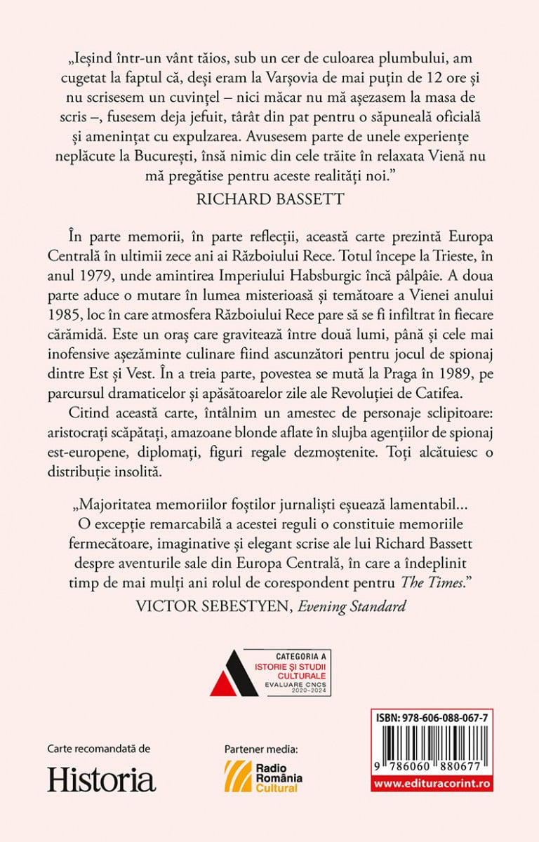 Cartea te poartă prin Europa Centrală în ultimii ani ai Războiului Rece, într-o serie de memorii pline de culoare, suspans și nostalgie. Richard Bassett rememorează experiențe trăite la Trieste în 1979, la Viena în 1985 și la Praga în timpul Revoluției de Catifea din 1989, surprinzând atmosfera tensionată, absurdă și fascinantă a unei epoci pe cale să dispară. Cu mult farmec și inteligență, autorul recompune o lume de aristocrați decăzuți, spioni misterioși și personaje excentrice, oferind o perspectivă personală și captivantă asupra sfârșitului unei ere istorice.