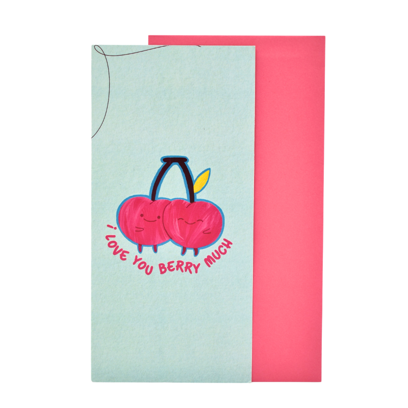 Felicitarea cu plic „I love you berry much” este alegerea ideală pentru a transmite într-un mod amuzant și afectuos cât de mult ții la cineva drag.