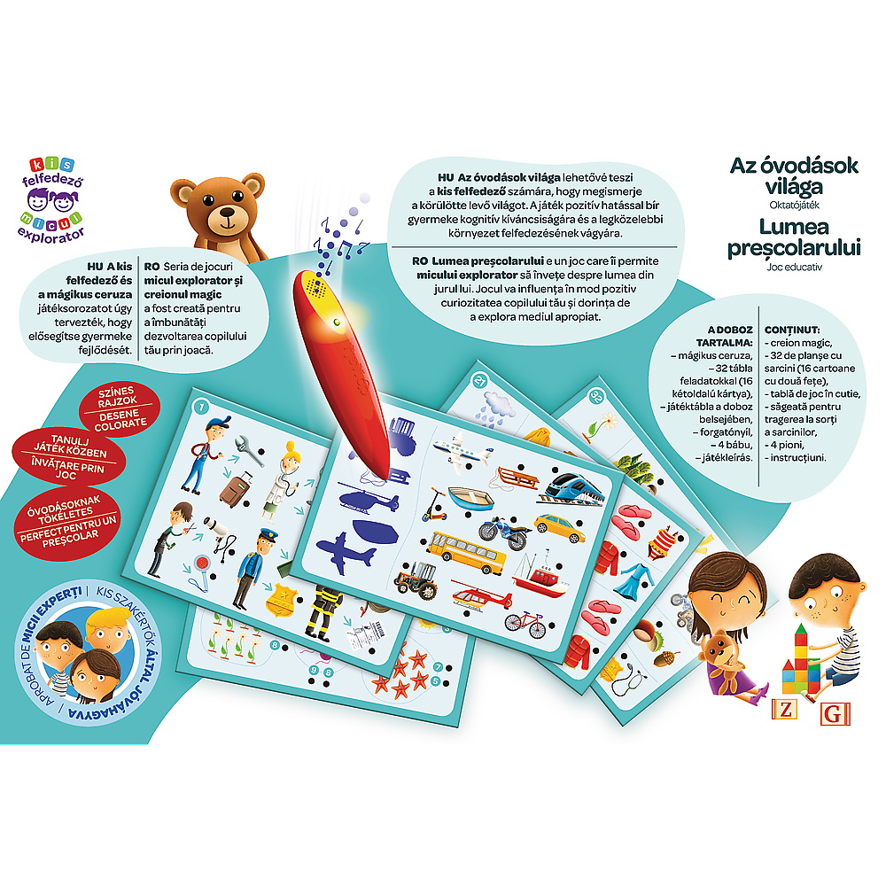 Lumea prescolarului e un joc care ii permite micului explorator sa invete despre lumea din jurul lui. Jocul va influenta in mod pozitiv curiozitatea copilului tau si dorinta de a explora mediul apropiat. Continut: creion magic, 32 de planse cu sarcini(16 cartonase cu 2 fete), tabla de joc in cutie, sageata pentru tragerea la sorti a sarcinilor, 4 pioni, instructiuni.