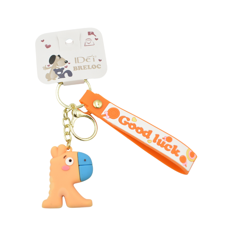 Brelocul cal de 12 cm are un aspect jucăuș și prietenos, fiind realizat din material flexibil și rezistent. Figurina în formă de ponei stilizat este colorată în nuanțe vii de portocaliu și albastru, cu detalii simpatice care îi dau personalitate. Este prevăzut cu o curelușă decorativă inscripționată „Good luck”, ce adaugă un plus de stil și îl face mai ușor de manevrat. Perfect pentru chei, ghiozdan sau geantă, acest breloc este potrivit atât pentru copii, cât și pentru adulți care apreciază accesoriile amuzante. Este un mic detaliu care aduce zâmbetul pe chipul oricui și poate fi și o idee de cadou inspirată.