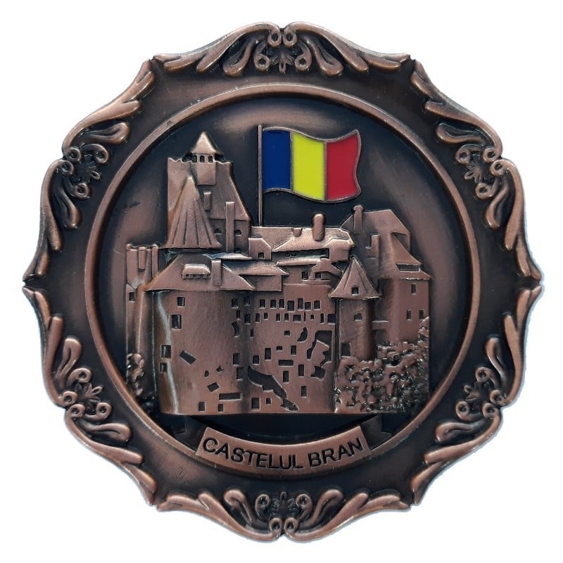 Magnetul metalic rotund cu Castelul Bran surprinde in detalii fine imaginea uneia dintre cele mai faimoase atractii turistice din Romania. Realizat din metal de calitate, cu finisaje atent lucrate, magnetul imbina eleganta designului cu simbolurile nationale, redand perfect farmecul Transilvaniei si al legendei lui Vlad Tepes.