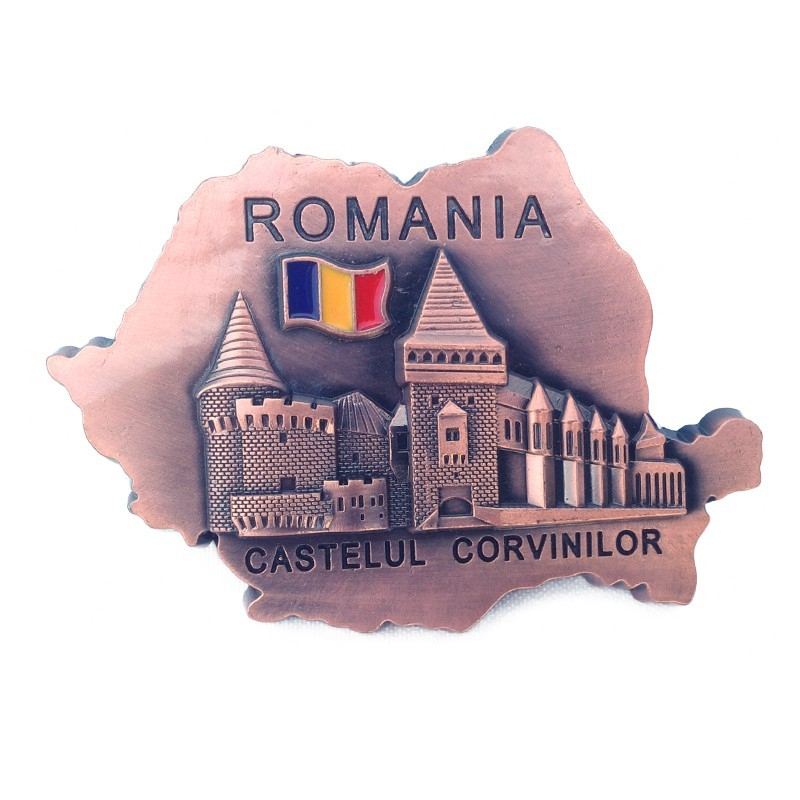 Acest magnet metalic redă într-un mod artistic una dintre cele mai impresionante construcții medievale din România – Castelul Corvinilor din Hunedoara. Realizat în formă de hartă a țării, magnetul include detalii fine în relief și culorile tricolorului românesc, oferind un aspect elegant și autentic.