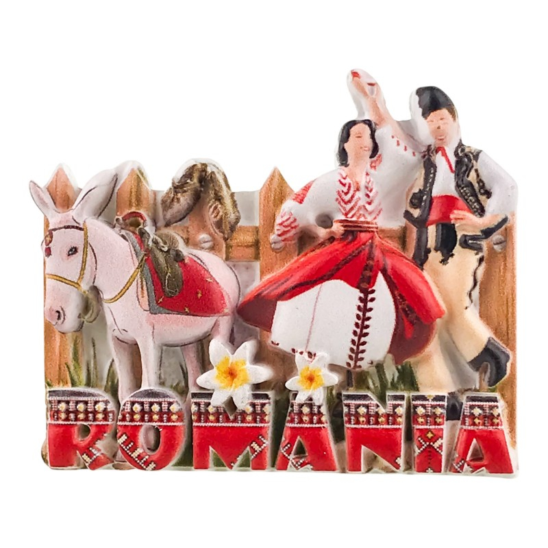 Realizat din rasina de calitate, magnetul reda cu atentie la detalii o scena traditionala romaneasca, in care dansul popular si simbolurile rurale se imbina intr-o reprezentare plina de viata. Culorile vii si expresivitatea personajelor transmit bucuria sarbatorilor de la sat, iar magarusul adauga o nota jucausa si autentica.