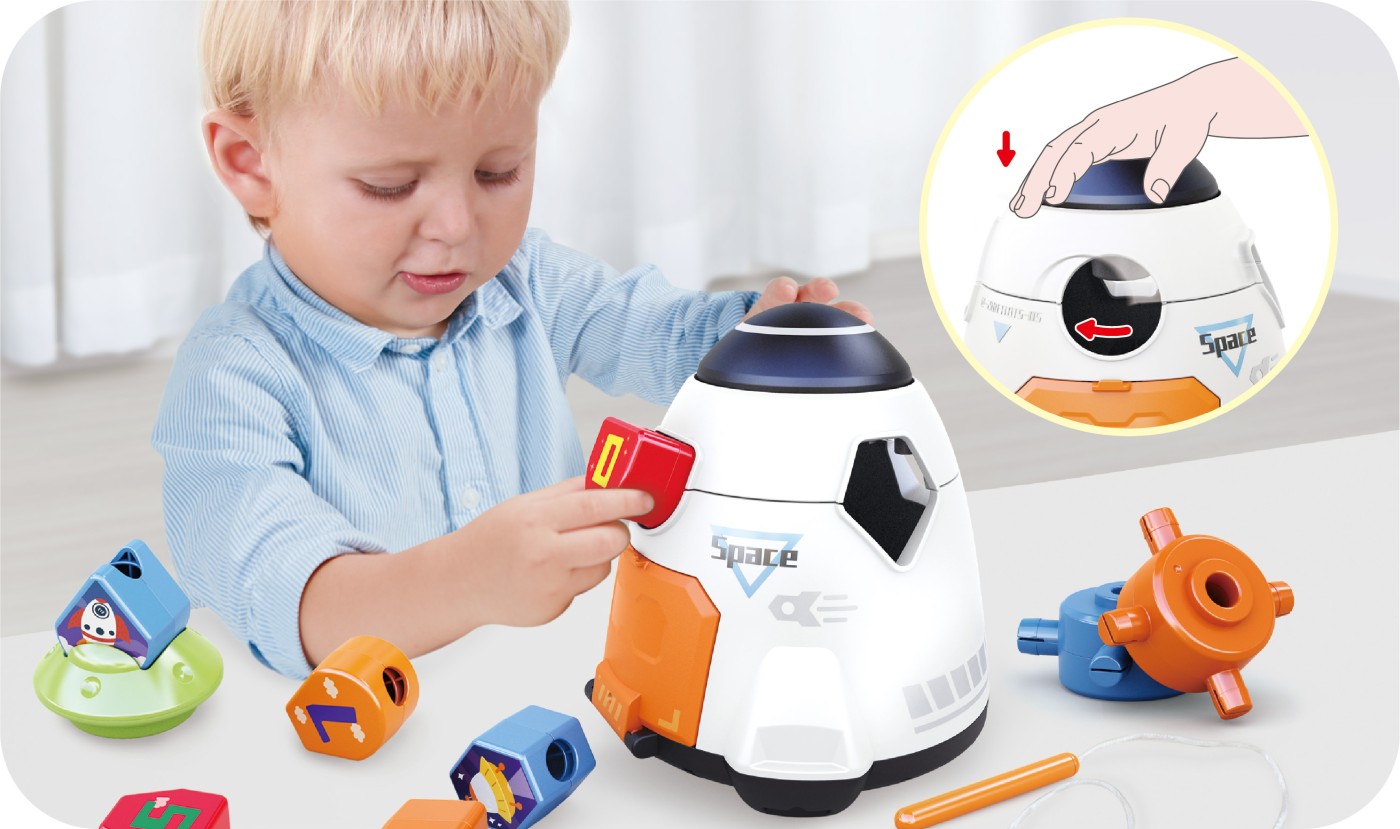 O nava spatiala frumoasa in care copiii pot alege caramizile si pot construi o varietate de forme si activitati diferite care le ajuta sa-si dezvolte imaginatia! Î nsirati formele: puteti insira blocurile geometrice de-a lungul gaurilor unul cate unul, astfel incat copilul sa invete sa sorteze formele, sa recunoasca culorile si sa dezvolte coordonarea mana-ochi. Sortare forme: invata grafica matematica cu jocul de potrivire a formelor. Apasati partea superioara a navei spatiale si capacul superior se va roti astfel incat gaurile din cabina sa isi schimbe forma. Asezati blocurile potrivite in gaurile cabinei pentru a invata recunoasterea formei.
