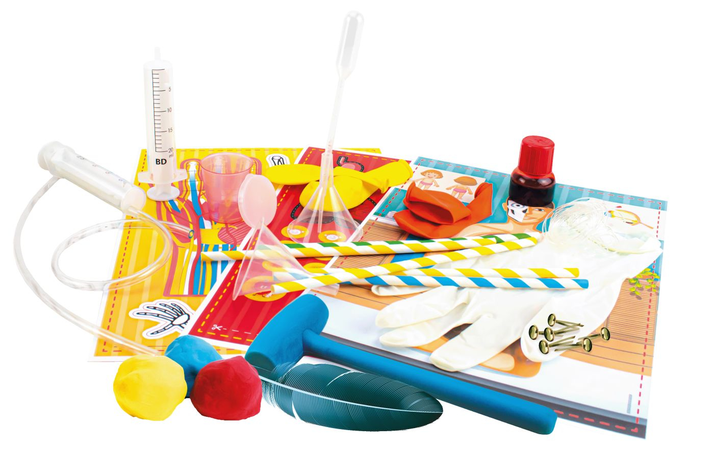 Joc educativ descopera corpul uman. Cu acest joc, patrunde in fascinanta lume a corpului uman si descopera cum functioneaza diferitele sale sisteme. Construieste un schelet articulat, simuleaza functionarea plamanilor, invata despre muschi, sistemul digestiv si circulator, si multe altele. Exploreaza 12 activitati stiintifice distractive si interactive care iti vor starni curiozitatea si cunostintele despre corpul uman. Continut kit: seringi, manusa, plastiline colorate, tuburi din plastic, baloane, ciocanel reflex, colorant rosu, pahare gradate cu capac, palnii, ata de pescuit, pini de arhivare, paie, pipeta de patiserie, pana, cartonas – schelet si mana, cartonas – corpul uman, cutie – corpul uman, stickere cu corpul uman, cartonas – metru.