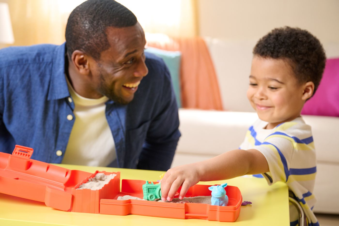 Un set de joaca cu nisip de interior excelent pentru cei mici: cu nisip magic natural maro de 340 g, acestia pot construi, modela, stampila urme de animale si numere, precum si planta si recolta in jocul de rol. Deoarece nisipul Kinetic Sand se lipeste de sine si nu de maini, este ideal pentru jocurile cu nisip in interior, poate fi modelat deosebit de bine si formeaza stampile si matrite ascutite ca briciul. Cu figurinele vaca si gaina, copiii se pot cufunda in jocuri imaginative de la ferma, in timp ce invata despre urmele pe care aceste animale le lasa in nisip. Tractorul, pe de alta parte, impinge numere in nisip atunci cand este rostogolit. Datorita structurii nisipului Kinetic Sand, este usor de curatat si – foarte practic – se depoziteaza in cutia pliabila pana data viitoare. Deoarece nisipul Kinetic Sand nu se usuca, este intotdeauna gata de utilizare.