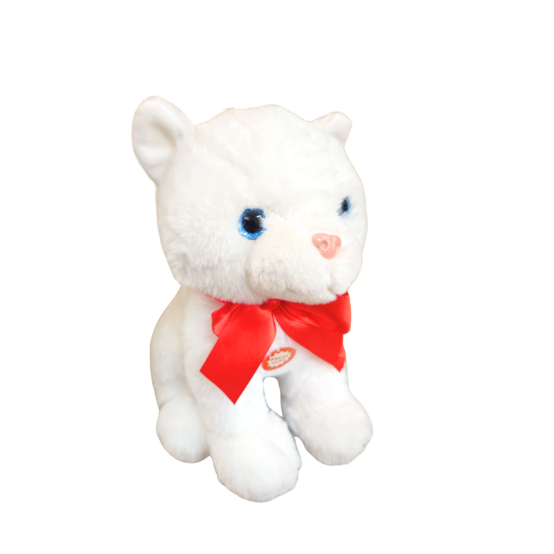 Această pisică din pluș de 20 cm este un companion adorabil pentru cei mici, moale la atingere și decora cu o fundiță roșie care îi dă un aer jucăuș. Când o apeși, emite sunete amuzante care fac joaca și mai distractivă. Este perfectă pentru moment de alint, cadouri sau pentru a deveni prietenul preferat al copilului tău.