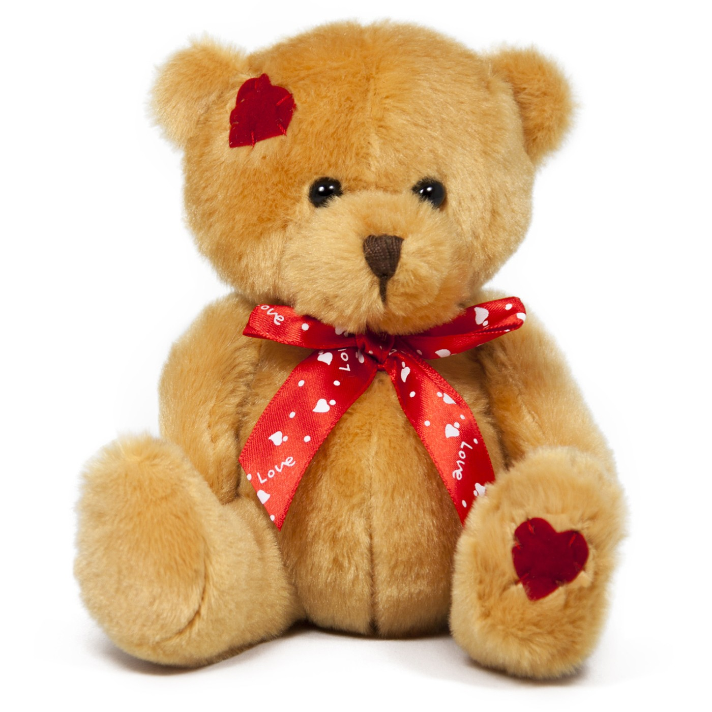 Un ursulet de plus maro-auriu, cu o blanita moale si pufoasa, sta asezat intr-o pozitie prietenoasa, parca invitand la o imbratisare. Ochii negri, mici si stralucitori, impreuna cu nasul maro inchis, brodat in forma de inimioara, ii confera o expresie dulce si inocenta. O funda rosie aprinsa, cu mici buline albe si cuvantul "Love" scris in alb de mai multe ori, ii inconjoara gatul, adaugand o nota vibranta de culoare si un mesaj clar de afectiune. Doua petice rosii in forma de inima, unul aplicat pe urechea stanga si celalalt pe piciorul drept, completeaza designul adorabil si subliniaza tema dragostei. Umplutura moale si pufoasa il face perfect pentru a fi imbratisat si alintat.