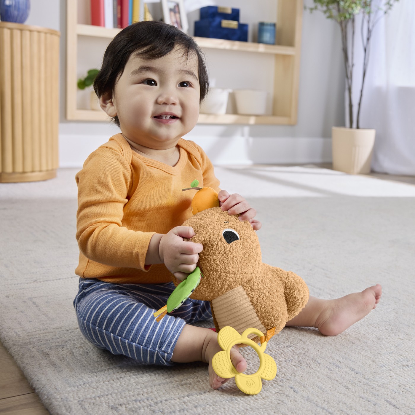 Dragut, dragalas si gata de joaca, jucaria de plus Cuddly Capibara de la Fisher-Price este plina cu o multime de detalii senzoriale pe care bebelusii le pot explora. Pe langa culori stralucitoare, tesaturi texturate si sunete distractive, capibara vine cu propriile „gustari” care stimuleaza simturile bebelusilor in timp ce se joaca. Acest prieten moale si dragalas are dimensiunea potrivita pentru nou-nascuti si le va oferi celor mici un sentiment de confort si siguranta acasa sau in calatorii.