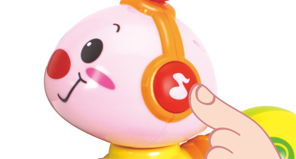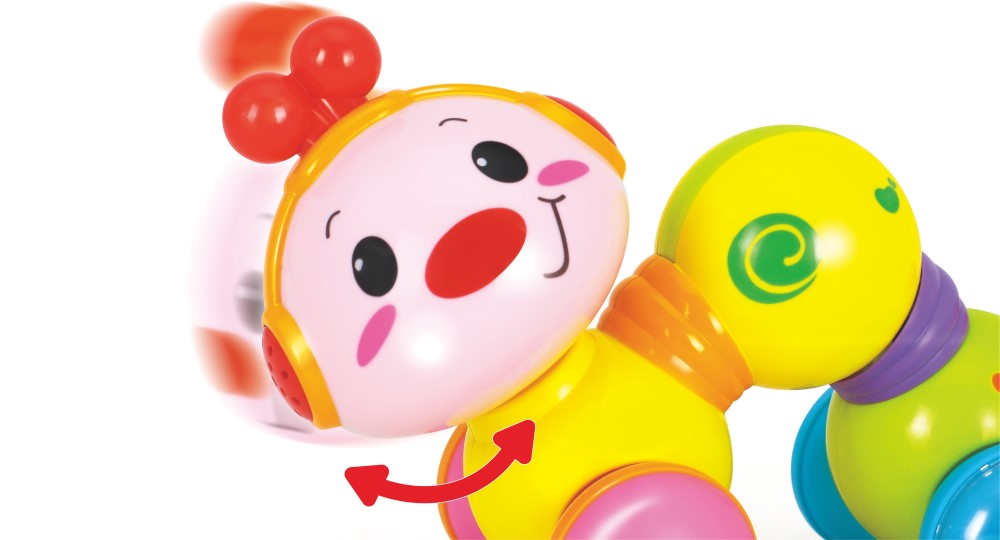 Jucariile contribuie la dezvoltarea copiilor si jocul este o parte esentiala a cresterii. O jucarie este un obiect pentru care un copil se joaca. Împingeti si apasati pe partea din spate a viermisorului, acesta va porni la drum, iar copilul va fi incurajat sa faca si el miscare. Jucaria Viermisorul Fericit poate si canta si lumina cand cand este actionat butonul plasat pe capul lui. Sunt incluse mai multe melodii. Dezvolta coordonarea ochilor mainii si invata conceptul de cauza si efect. Ofera-i copilului o atmosfera de distractie