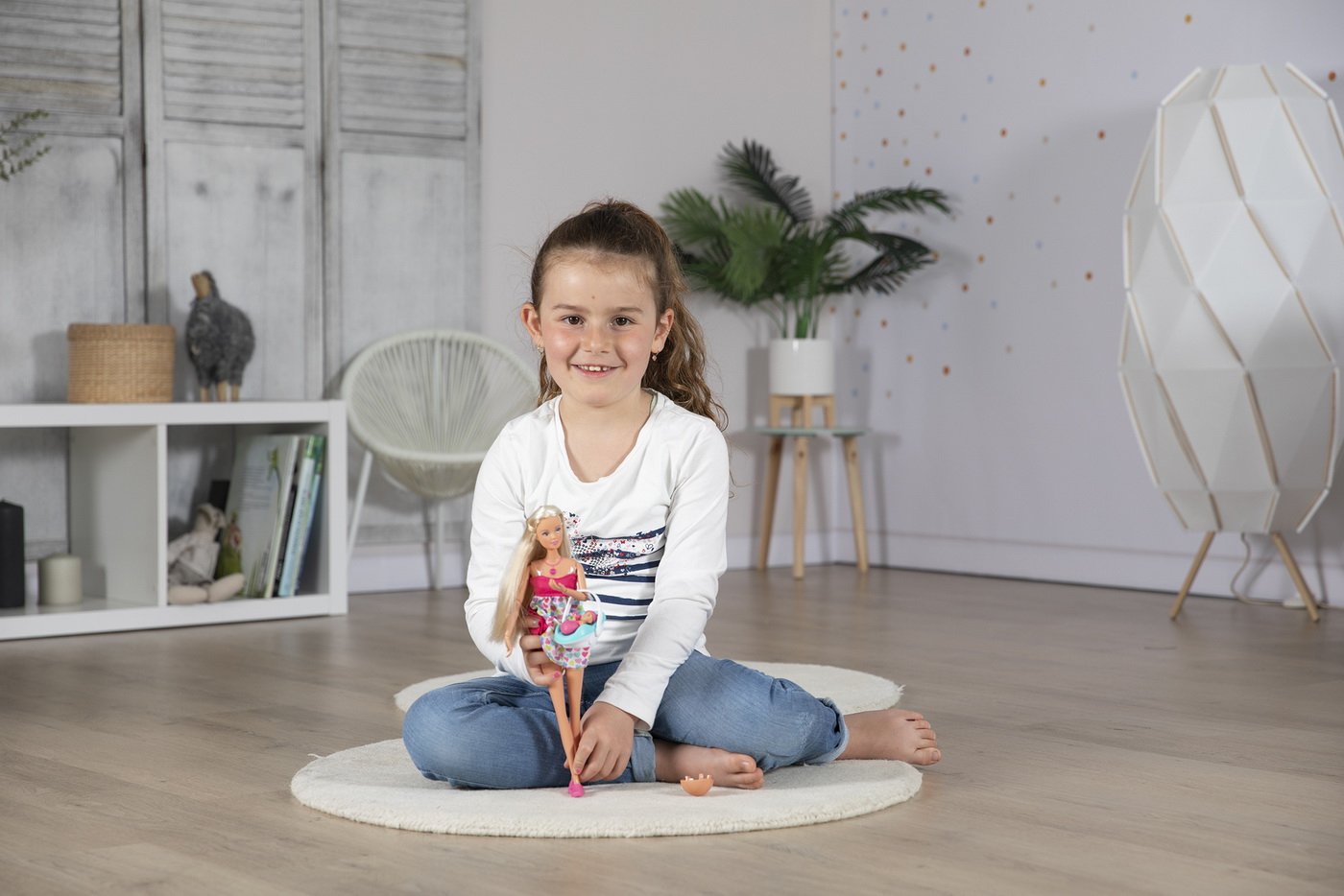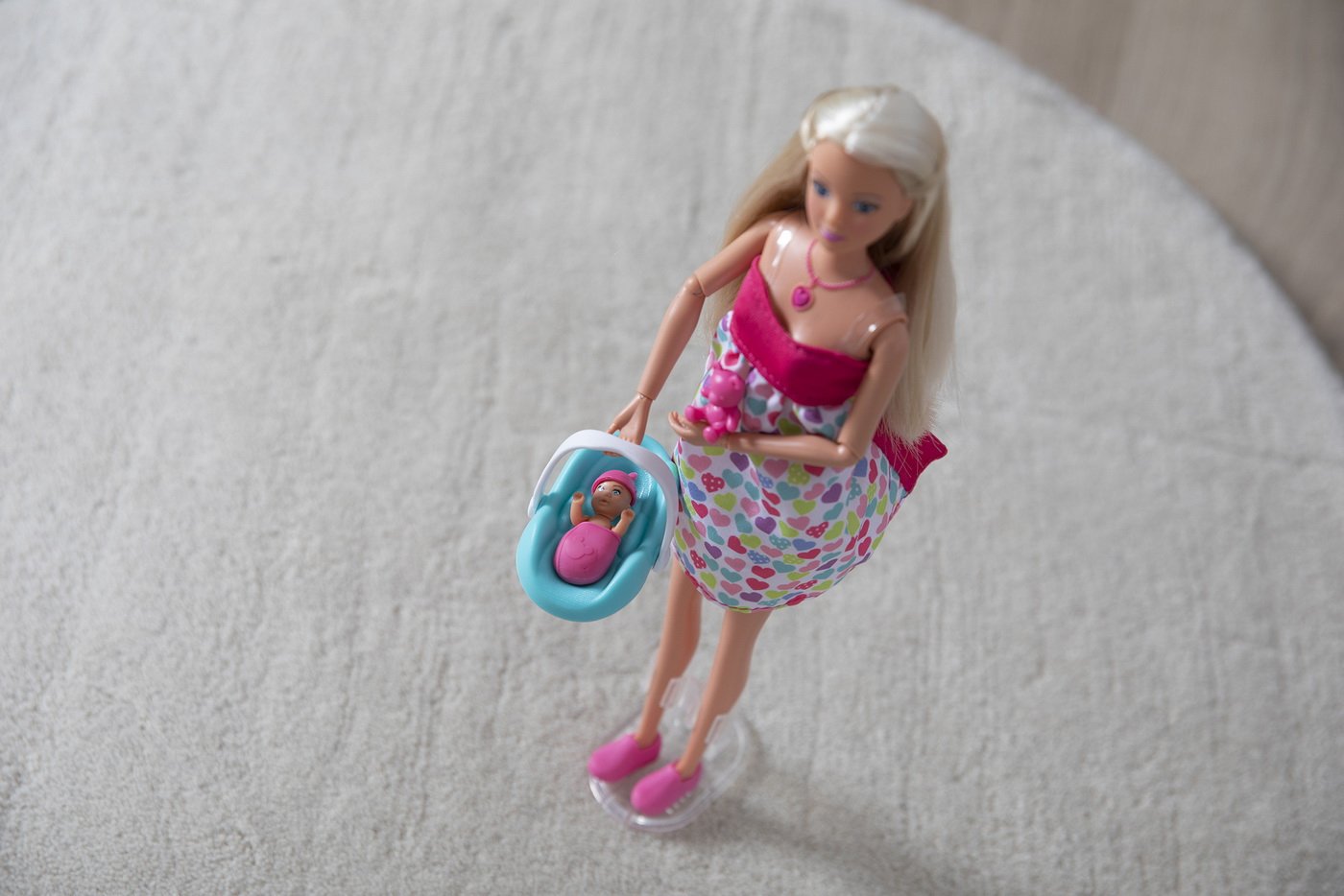 Papusa Steffi este insarcinata si asteapta cu nerabdare nasterea copilului. Dupa nastere, burtica voluminoasa poate fi usor indepartata si inlocuita cu o burta plata. Pe parcursul sarcinii si dupa nastere bebelusul va scoate anumite sunete reale, bataile inimii, rasul sau plansul unui copil. Setul include si un scaun auto si un certificat de nastere pentru bebelus .