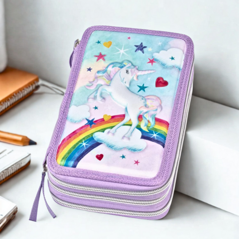 Penarul neechipat Faber-Castell – Unicorn este o alegere ideală pentru fetele care adoră magia și organizarea! Cu un design fermecător, în nuanțe pastel și un imprimeu cu unicorn prietenos, penarul transformă fiecare zi de școală într-o experiență mai plăcută.