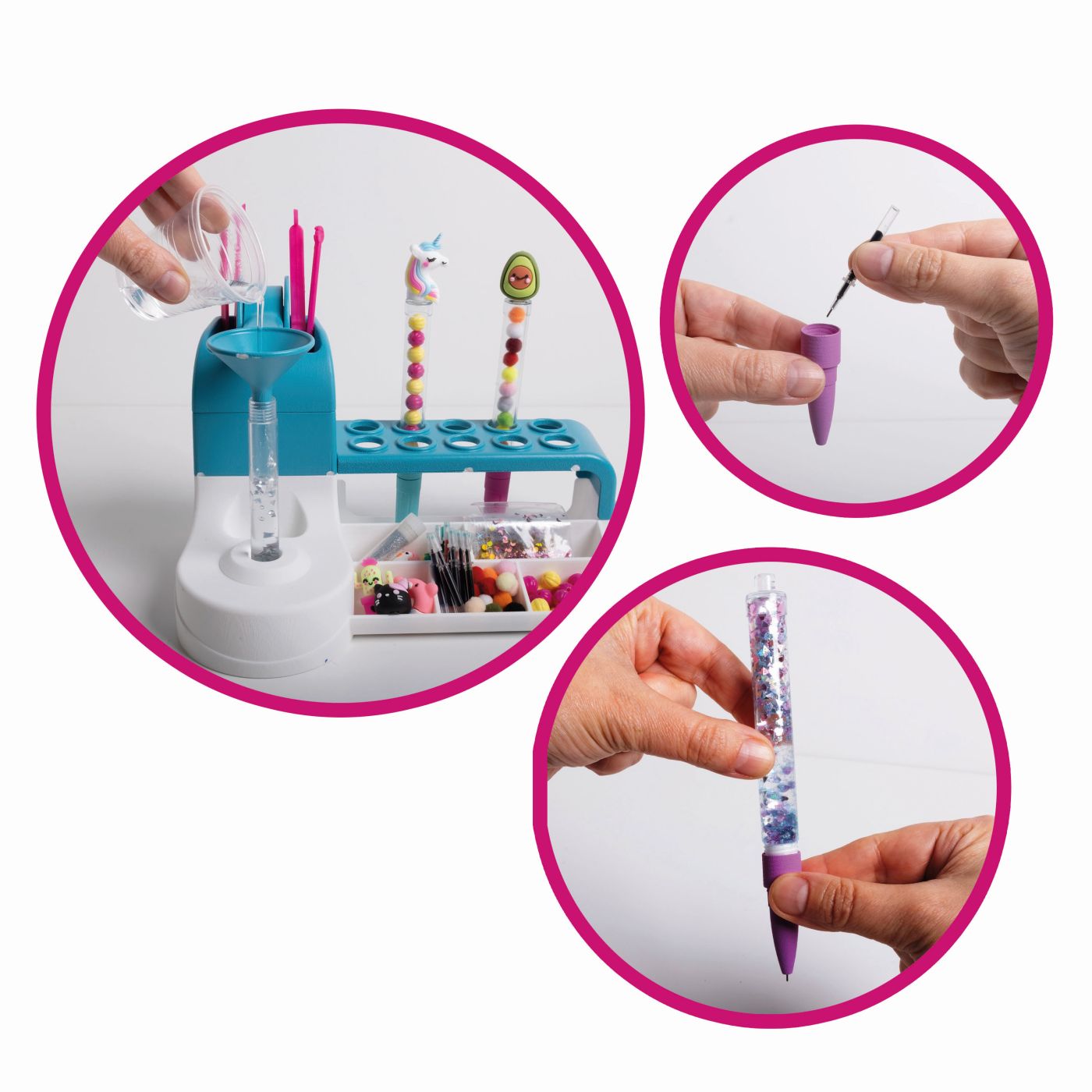 Acest set creativ ofera o modalitate distractiva de a-ti petrece timpul creand o multime de pixuri colorate si decorate. Acesta permite copiilor sa isi creeze si sa isi personalizeze propriile stilouri cu o varietate de accesorii si decoratiuni. O statie de lucru la indemana si un set bogat de instrumente sprijina activitatile de joaca, avand rezultate uimitoare. Acest studio de creatie nu numai ca incurajeaza creativitatea, ci si dezvolta abilitatile practice si cognitive ale copiilor, permitandu-le sa se bucure de procesul creativ si sa creeze propriile lor opere de arta functionale. Setul contine: baza din plastic si accesorii pentru depozitarea elementelor si a creioanelor pe care le creati, palnie si instrumente, protectii antiderapante, 10x recipiente, dopuri, capace, 12x cartuse de cerneala in diferite culori, sclipici, margele,10 figurine din cauciuc, manual de intructiuni.