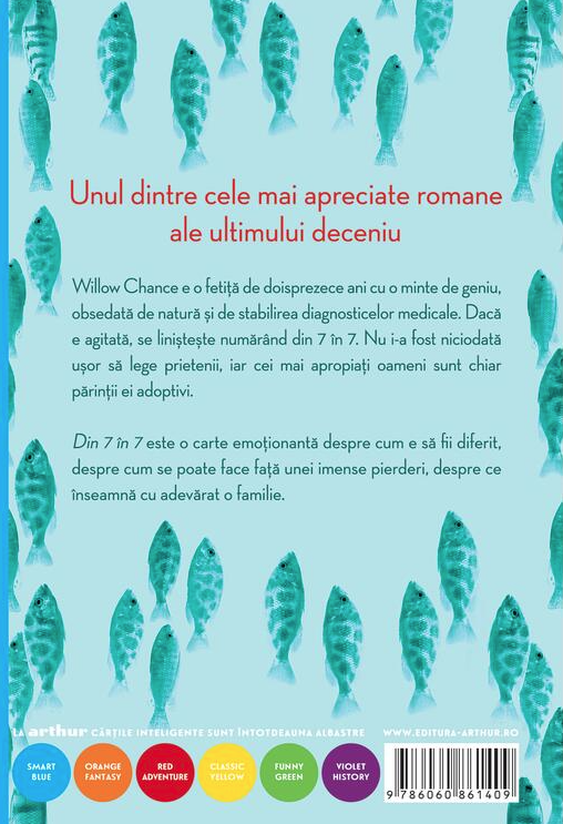 „Din 7 în 7” este unul dintre cele mai apreciate romane pentru copii și adolescenți ale ultimului deceniu, o poveste care vorbește cu delicatețe despre durere, speranță și puterea legăturilor umane. Protagonista, Willow Chance, este o fetiță de doisprezece ani cu o minte sclipitoare, pasionată de natură și de descifrarea misterelor medicale. Pentru a-și păstra echilibrul, are un ritual aparte: numără din 7 în 7.