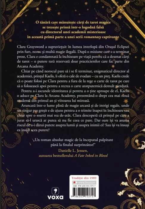 „Arcana Academy. Cartea întâi” de Elise Kova deschide o serie romantasy plină de tensiune, magie și întorsături neașteptate. Clara Graysword a trăit până acum pe muchie de cuțit, supraviețuind prin furt și magie interzisă. După ce este condamnată la închisoare pe viață pentru desenarea unor cărți de tarot, destinul îi schimbă direcția atunci când enigmaticul director al Arcana Academy, prințul Kaelis, îi oferă o șansă de scăpare.