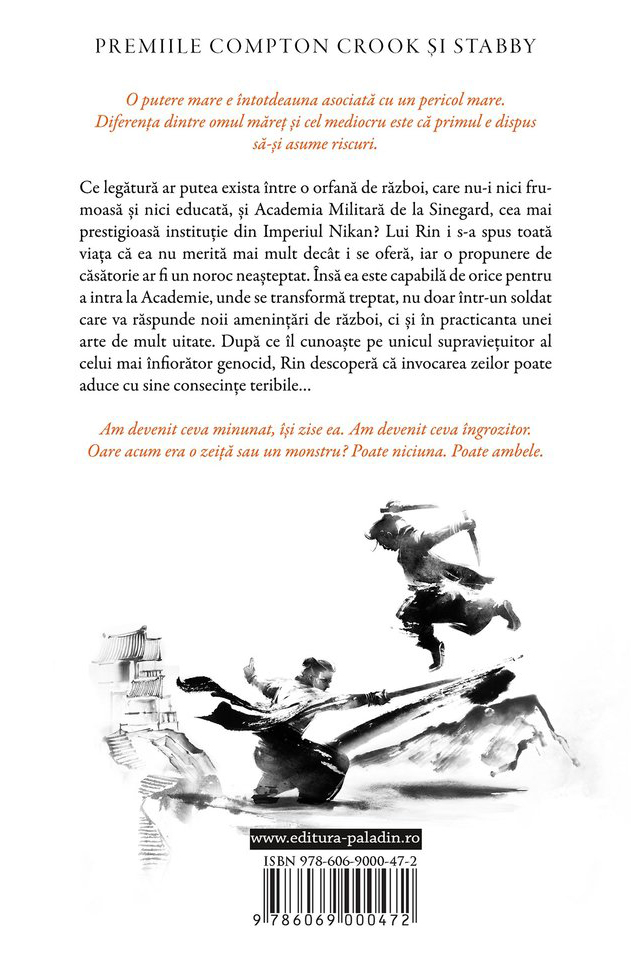 Acolo, printre elita imperiului, ea descoperă atât ambiția și disciplina necesare pentru a deveni soldat, cât și un adevăr mult mai întunecat: puterea de a invoca zeii nu a dispărut, ci se ascunde, așteptând să fie trezită. Îndrumată de un mentor enigmatic și confruntată cu amenințarea unui nou război, Rin se transformă într-o forță imposibil de ignorat.