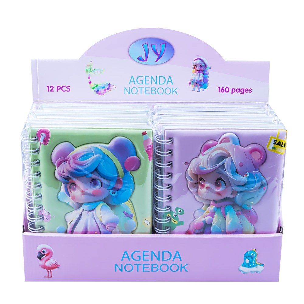 Filele sunt prinse cu arc metalic, ceea ce permite răsfoirea ușoară și utilizarea comodă. Coperta față este realizată din spumă moale, cu suprafață fină și model fetiță în relief, iar coperta spate este din carton, oferind susținere în timpul utilizării. Notesul este disponibil cu fundal de copertă în culori diferite, precum albastru, turcoaz, mov sau roz.