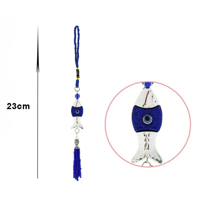 Un breloc decorativ în formă de pește, cu detalii albastre și argintii. Este prevăzut cu ciucuri din mărgele pentru un aspect elegant. Dimensiunea totală este de 23 cm.