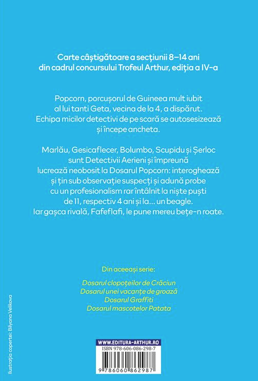 „Dosarul Popcorn” de Ana Rotea marchează începutul seriei „Detectivii Aerieni”, o colecție de aventuri detectivistice pentru copii. Povestea este construită asemenea unui puzzle: un caz misterios, detalii aparent nesemnificative, indicii ascunse și făptași greu de prins. Micii Detectivi Aerieni intră în scenă hotărâți să dezlege enigma, iar investigația lor se dovedește a fi plină de provocări, suspans și momente neașteptate.