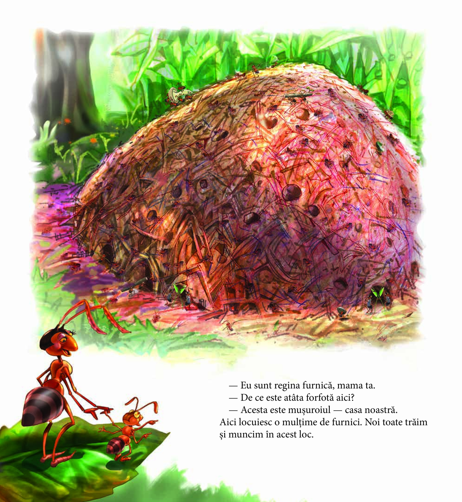Pe măsură ce învață despre viața din interiorul mușuroiului, Furnicuța simte nevoia să exploreze lumea de afară. Așa începe aventura ei prin pădure, unde întâlnește o șopârlă, un păianjen, un greiere, un licurici și un fluture – fiecare gata să-i răspundă cu răbdare la întrebările sale.