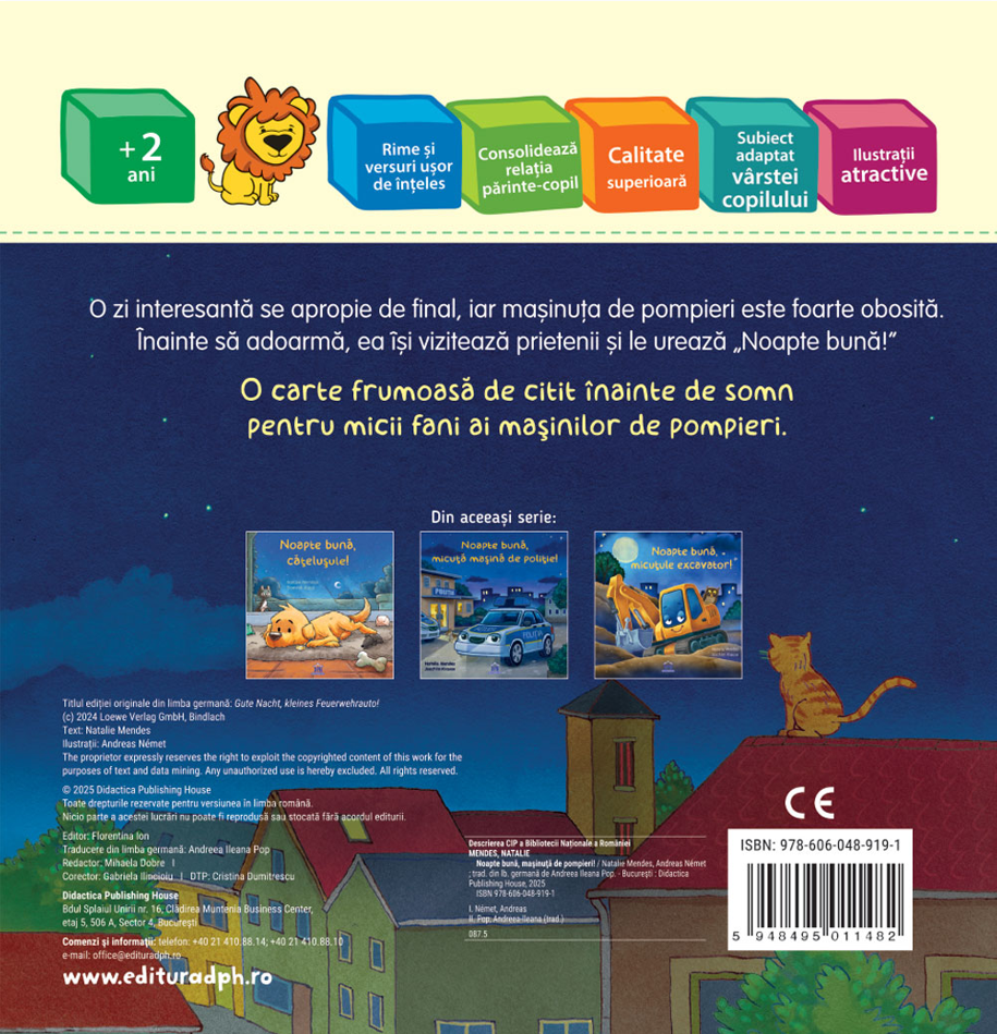 O poveste adorabilă de seară pentru micii pasionați de vehicule! „Noapte bună, mașinuță de pompieri”, scrisă de Natalie Mendes și ilustrată de Andreas Nemet, urmărește o mașinuță curajoasă care, după o zi plină de intervenții și aventuri, se pregătește de culcare, vizitându-și prietenii și urându-le „noapte bună”.