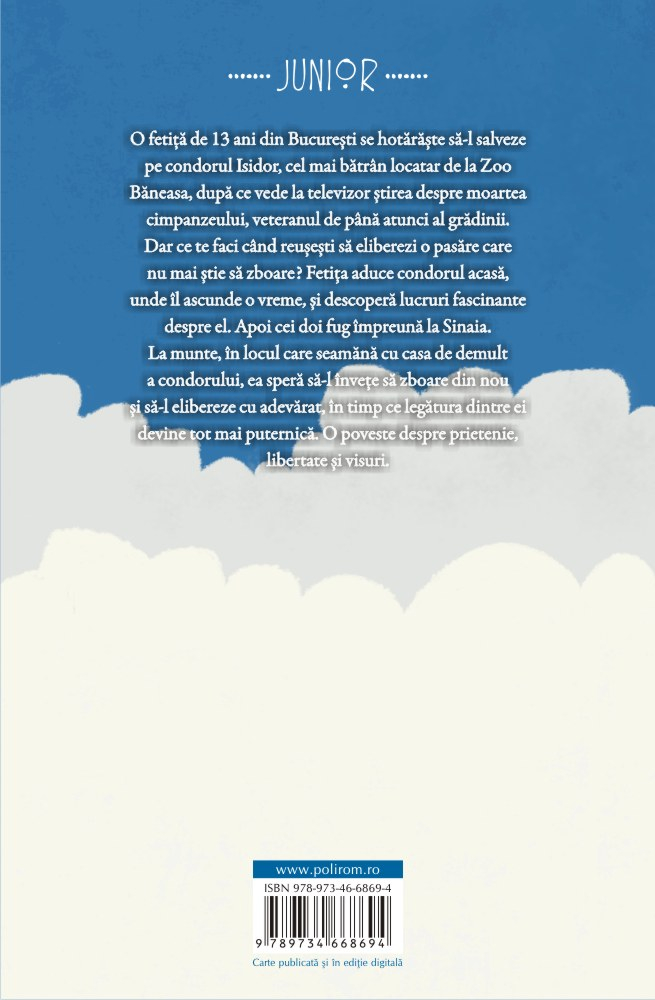 Romanul O vara cu Isidor semnat de Veronica D. Niculescu ii invita pe cititori intr-o aventura delicata si profunda, plina de emotie si tandrete. O fetita de 13 ani din Bucuresti decide sa salveze condorul Isidor, cel mai batran locatar de la Zoo Baneasa, dupa ce afla despre moartea cimpanzeului care fusese pana atunci veteranul gradinii zoologice. Cand reuseste sa-l elibereze, descopera ca pasarea nu mai stie sa zboare. Il adaposteste in secret, invata despre el si, in cele din urma, porneste intr-o calatorie spre munte, unde spera sa-l ajute sa-si recapete libertatea. Povestea devine o metafora despre curaj, maturizare si dragostea pentru toate fiintele vii. Scrisa cu sensibilitate si umor discret, cartea capteaza atentia copiilor si adultilor deopotriva, fiind o lectura emotionanta si plina de speranta.