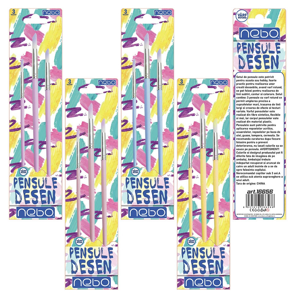 Setul de pensule NEBO cu vârf rotund în culori pastel este ideal pentru pasionații de pictură care își doresc precizie, finețe și confort în timpul creației. Setul conține trei pensule de dimensiuni diferite, așezate într-o husă transparentă din PVC suspendabilă, potrivită pentru depozitare și transport. Pensulele au vârf rotund din fibre sintetice de calitate superioară, flexibile și moi, care permit aplicarea uniformă a culorilor. Mansonul metalic cu prindere dublă fixează perfect firele, oferind durabilitate, iar mânerul este fabricat din plastic rezistent, disponibil în nuanțe pastel precum albastru, galben, mov și roz.