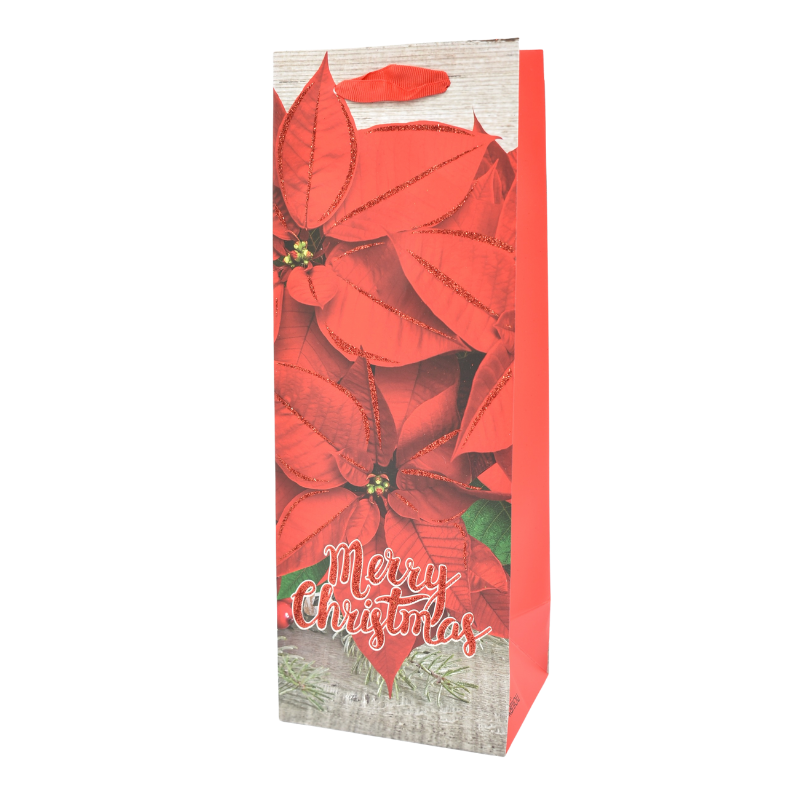 Această pungă cadou din hârtie pentru sticlă este perfectă pentru a oferi daruri de sărbători într-un mod elegant și festiv. Decorată cu imprimeu floral de Crăciun în nuanțe de roșu intens și accente sclipitoare, aduce un plus de farmec oricărui cadou.