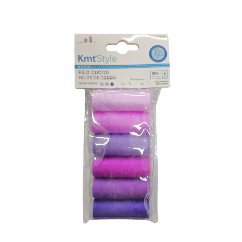 Set de ațe de cusut în nuanțe de mov, potrivite pentru lucrări variate de croitori și reparații textile. Fiecare rolă are 80 m, oferind material suficient pentru utilizări frecvente. Ideal pentru uz casnic și proiecte creative.