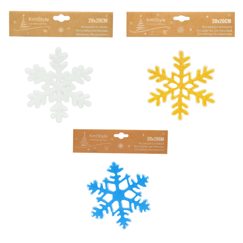 Fulgul are dimensiunea de 20x20 cm, fiind suficient de mare pentru a se remarca pe ferestre, uși sau mobilier. Se aplică ușor pe suprafețe netede și se îndepărtează fără a lăsa urme, astfel încât îl poți repoziționa ori de câte ori dorești. Este disponibil în trei variante de culoare – albastru, galben și transparent – perfecte pentru a se potrivi cu orice temă de Crăciun.